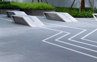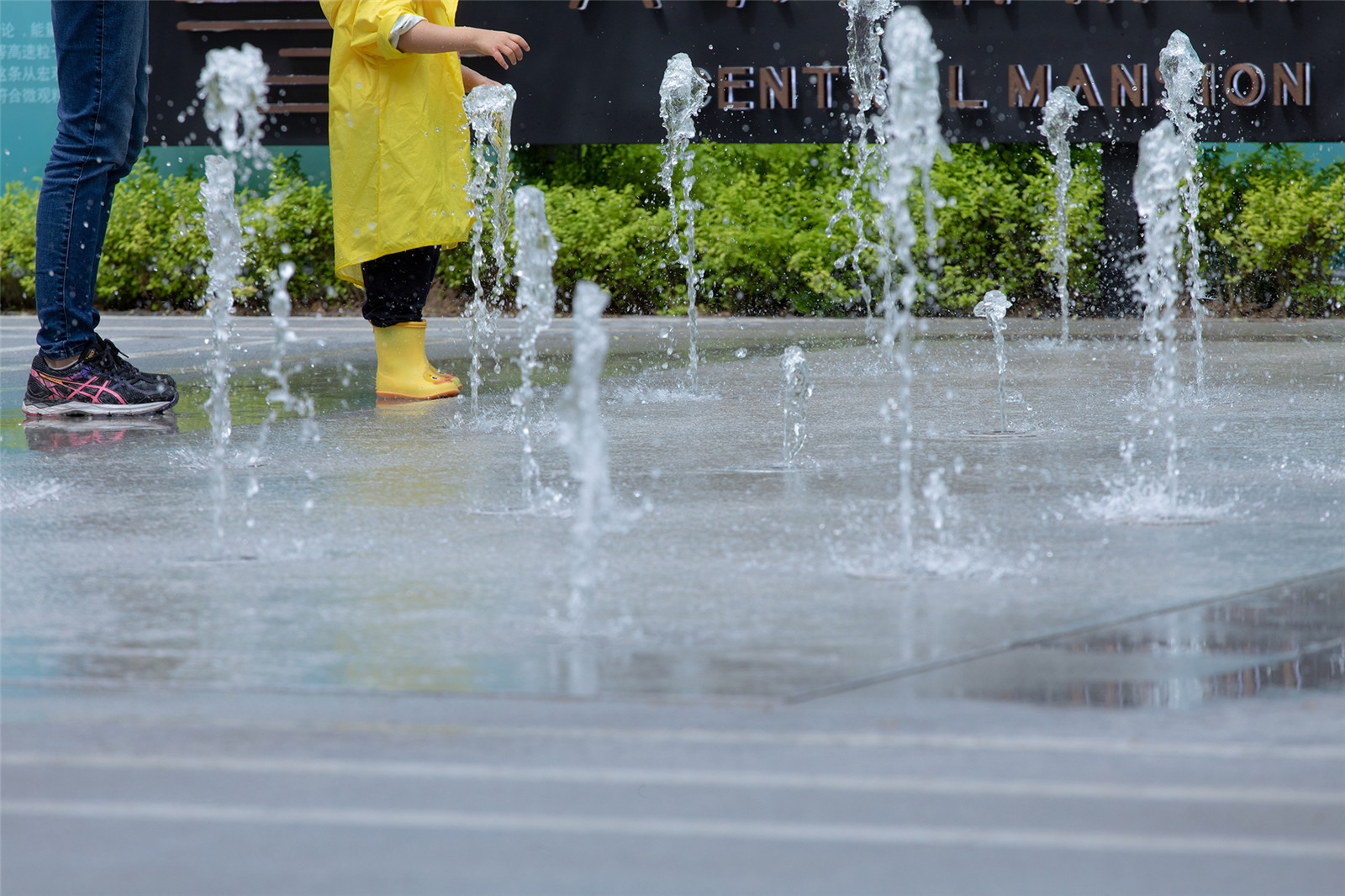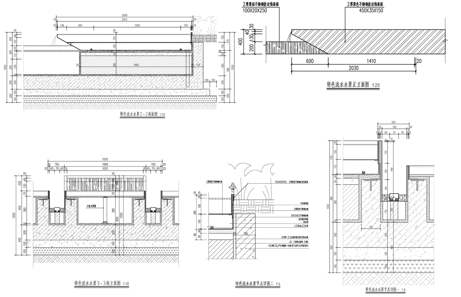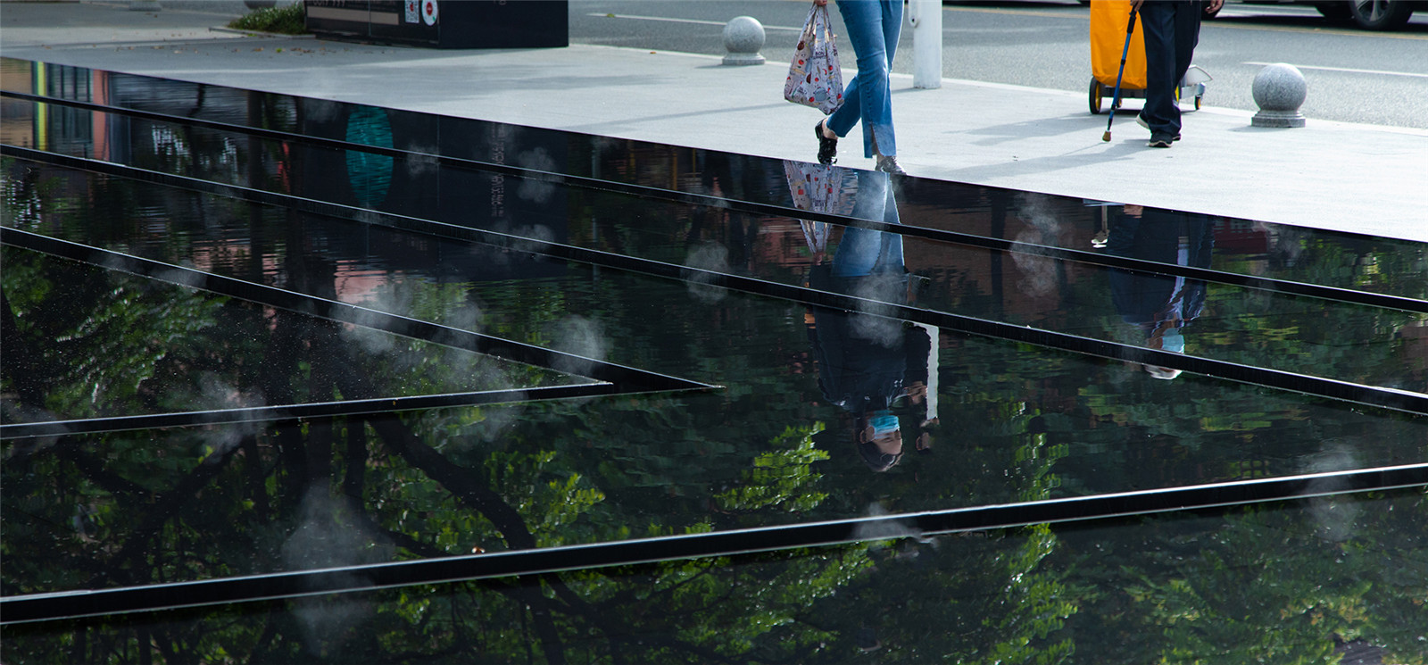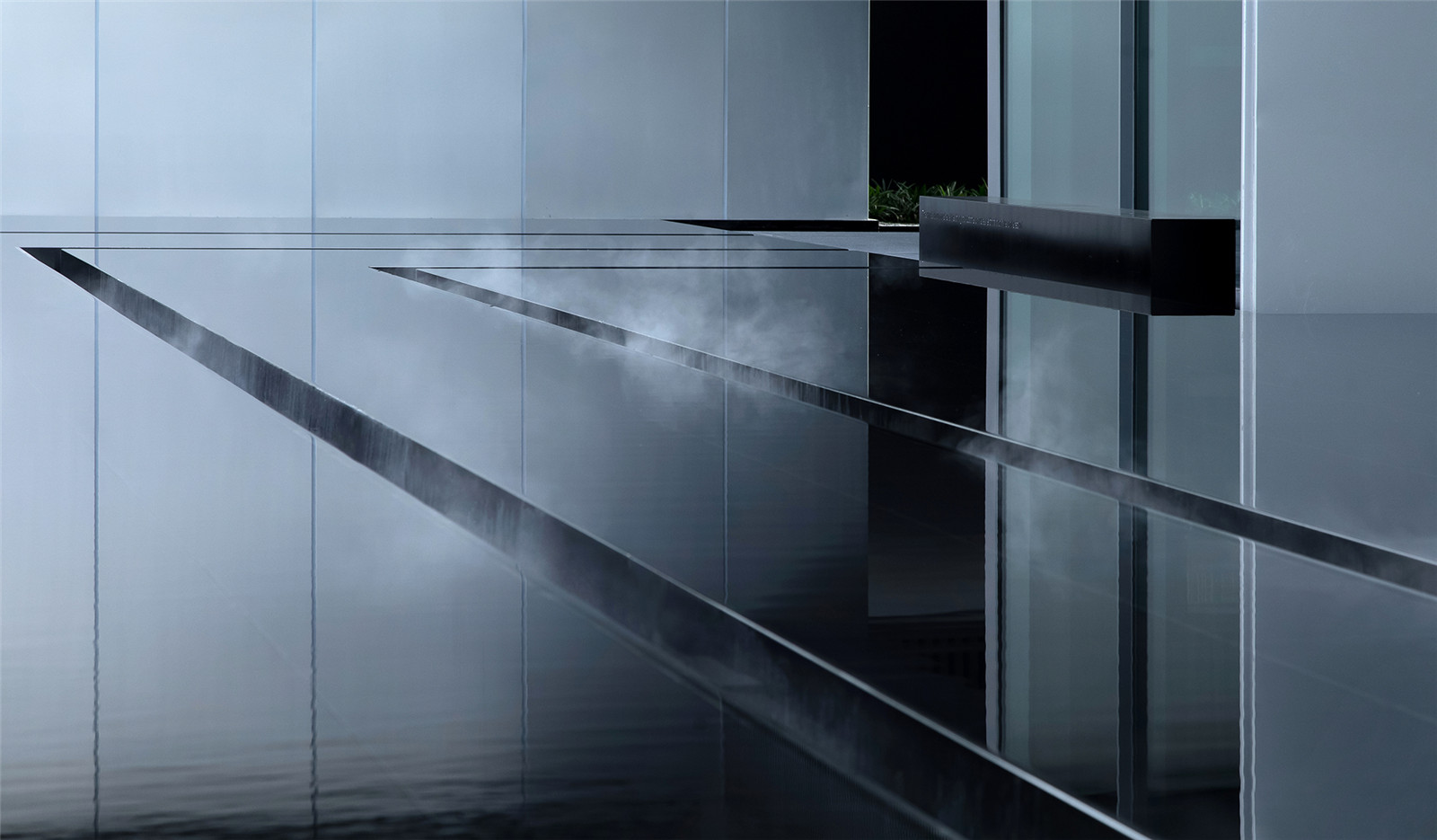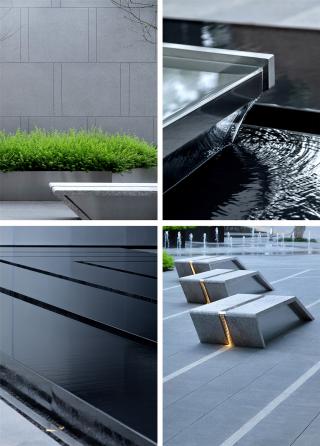 基于景觀的主題,本案選用了不銹鋼、黑鈦、黑色石材等現(xiàn)代感極強(qiáng)的材料,旱噴、鏡面靜水、霧噴反映了水的不同形態(tài),線形材料和燈帶的精細(xì)勾勒賦予場(chǎng)地動(dòng)感和方向性。通過(guò)材料和工藝細(xì)節(jié)的共同演繹,讓整個(gè)設(shè)計(jì)彌漫精確與冷靜的氛圍,與場(chǎng)地上人的活動(dòng)形成反差和對(duì)照。