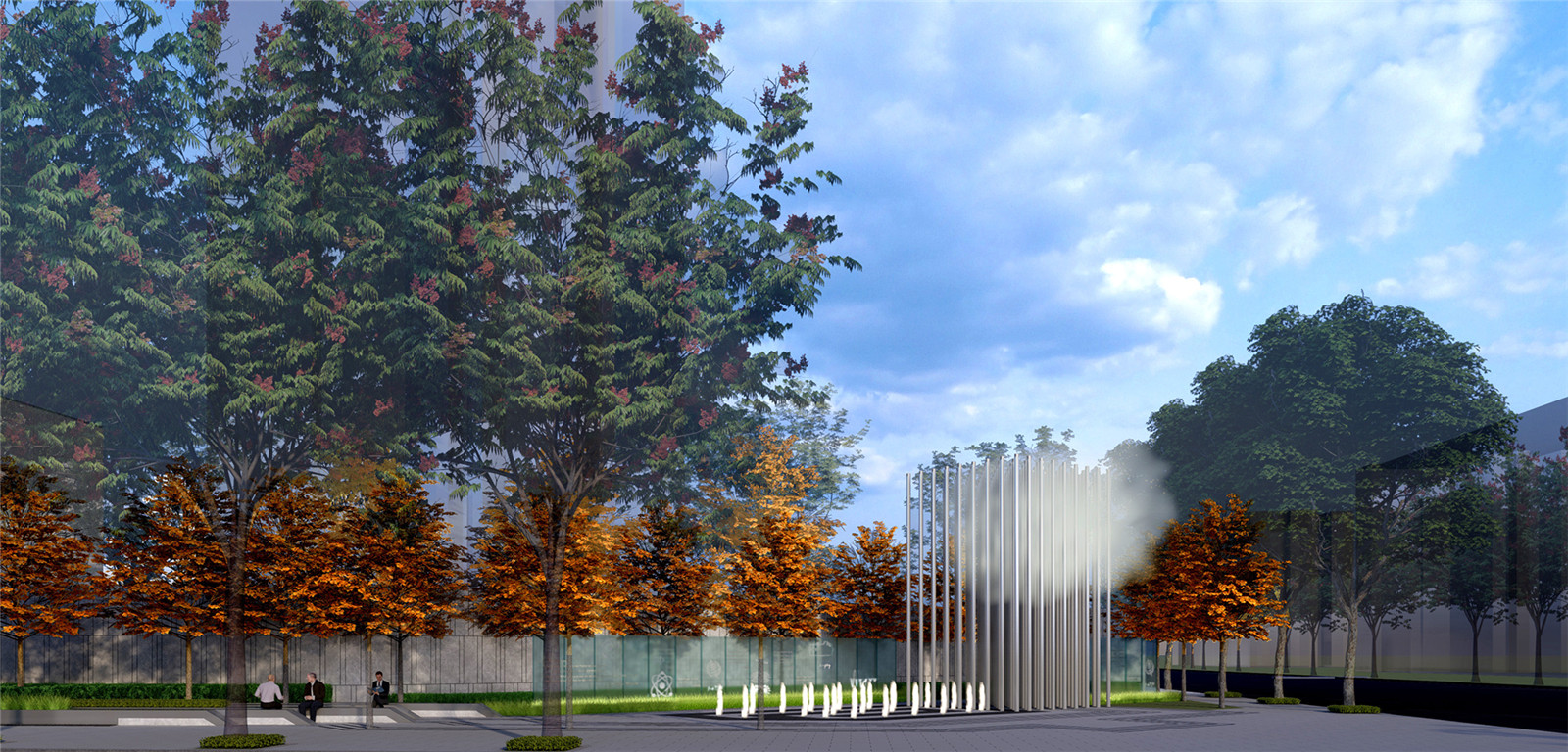 場(chǎng)地東北側(cè)緊鄰城市主干道,有很強(qiáng)的昭示潛力,這一塊轉(zhuǎn)角用地本屬于紅線外,經(jīng)過(guò)設(shè)計(jì)師的爭(zhēng)取納入到設(shè)計(jì)范圍之內(nèi),原設(shè)計(jì)以9x9排列的9米高金屬桿矩陣作為廣場(chǎng)的豎向統(tǒng)領(lǐng),也是整個(gè)設(shè)計(jì)的開端,無(wú)論開車或是行人,均得以獲得場(chǎng)所的印象。廣場(chǎng)上的淺色石材線條、旱噴點(diǎn)仿佛是電路板上的元件,將能量從這里向場(chǎng)地深處輸送。
