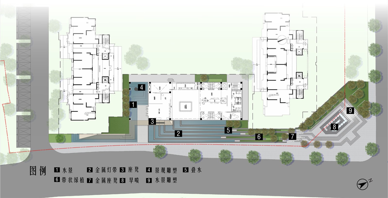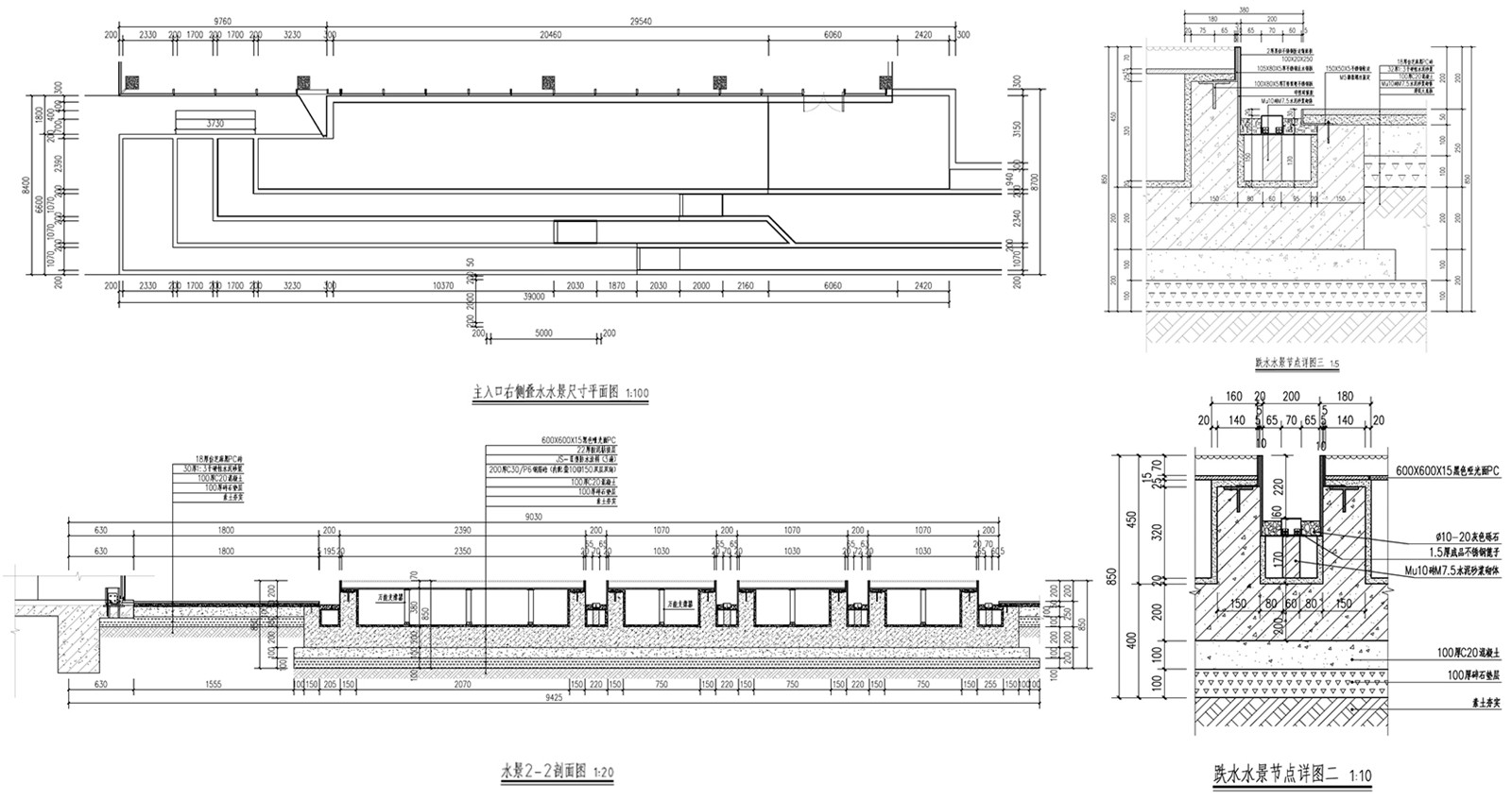 經(jīng)過(guò)一段平直安靜的水面之后,水景線條順由建筑體量的退進(jìn)趨勢(shì)垂直轉(zhuǎn)折,水景寬度與建筑的幕墻模數(shù)對(duì)應(yīng),開始為進(jìn)入建筑內(nèi)部做視覺(jué)上的引導(dǎo),也預(yù)示著下一個(gè)能量波峰的到來(lái)。