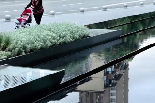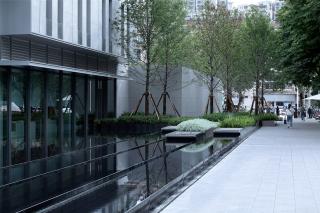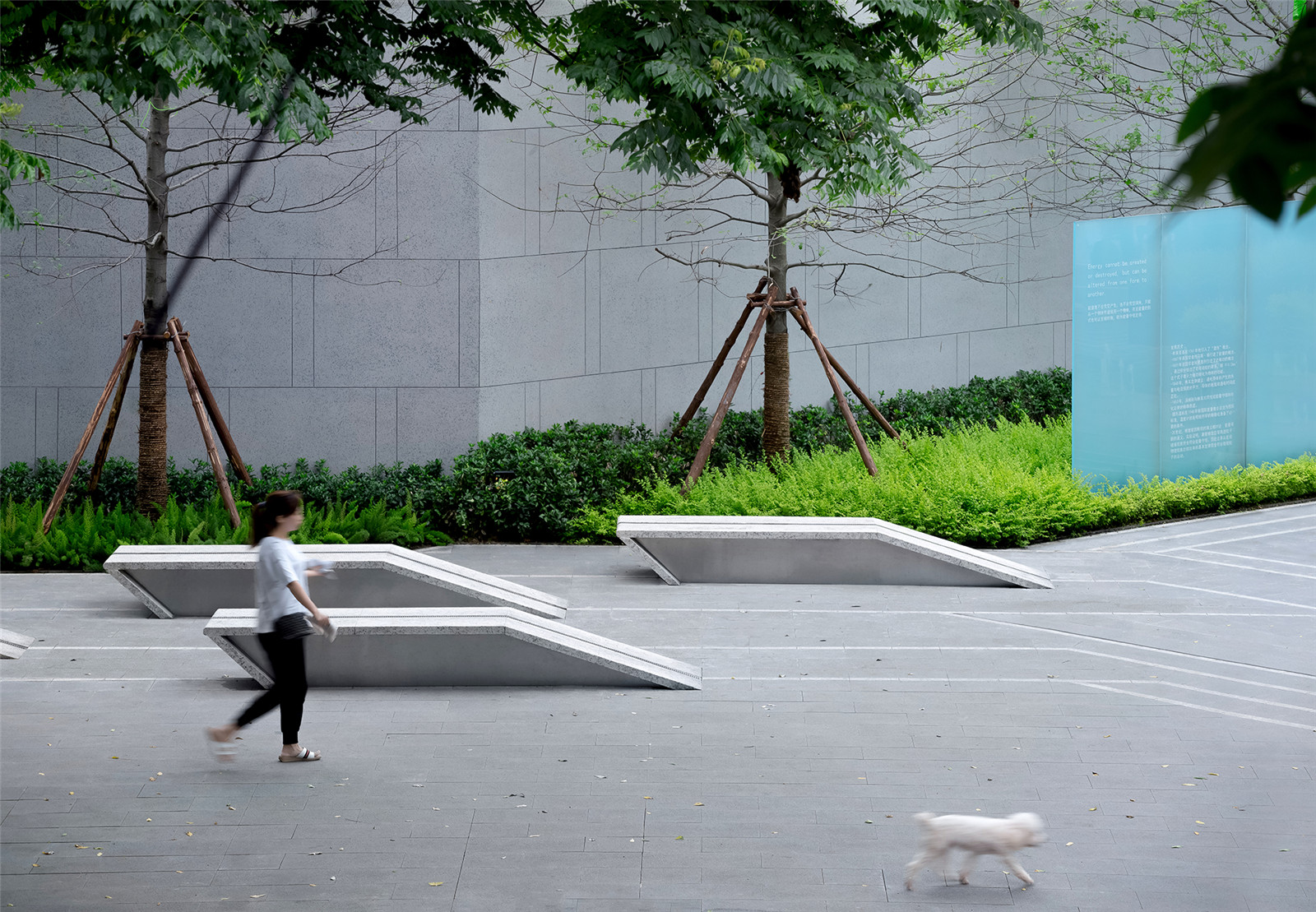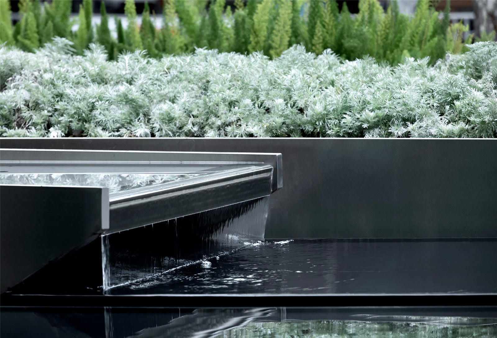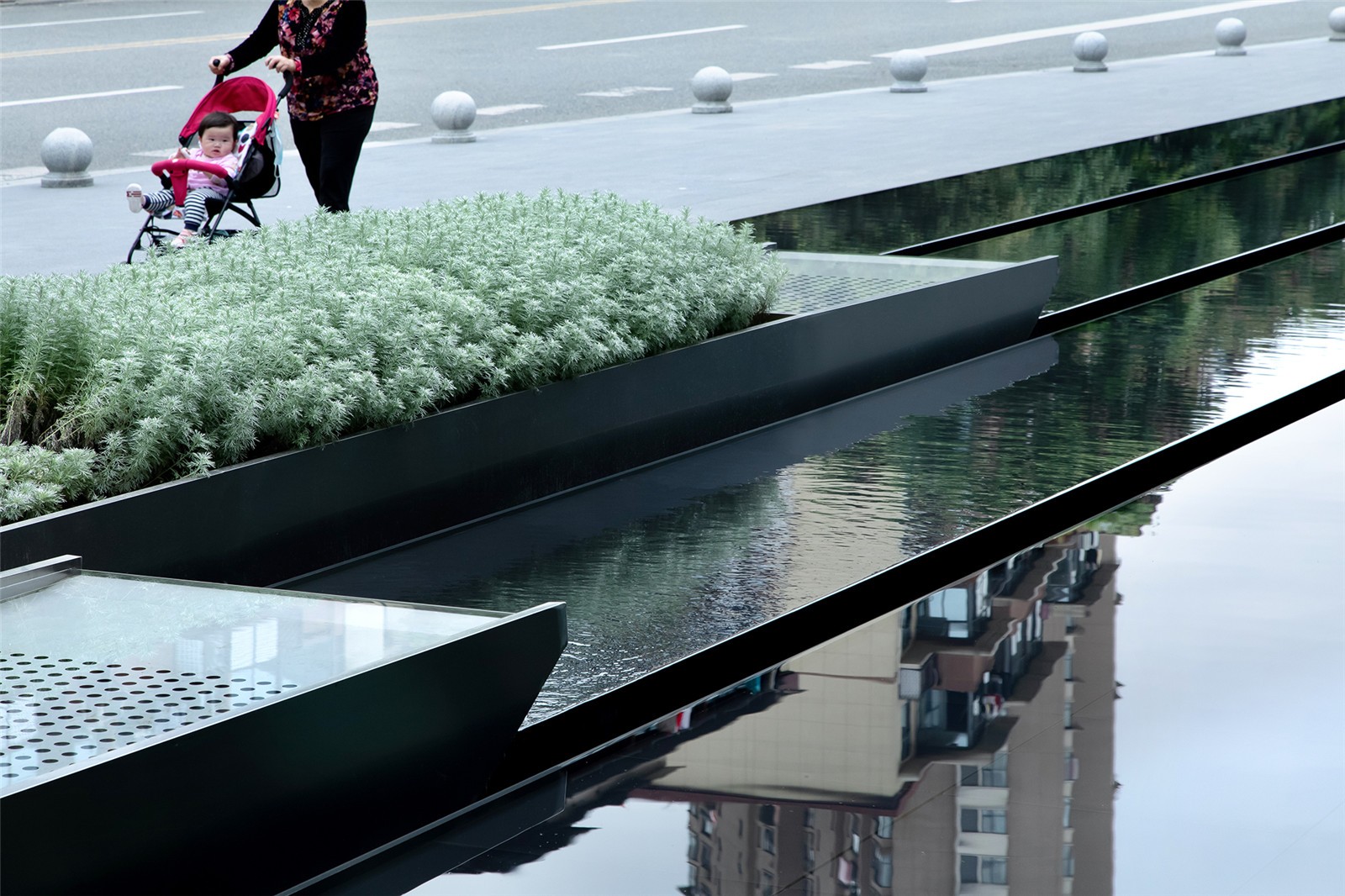 種植池經(jīng)由落水口的細(xì)節(jié)轉(zhuǎn)化為橫向水池,暗喻能量的繼續(xù)傳遞,以利落的金屬收邊,景觀與建筑材料的呼應(yīng)進(jìn)一步強(qiáng)化了場(chǎng)地的整體性。