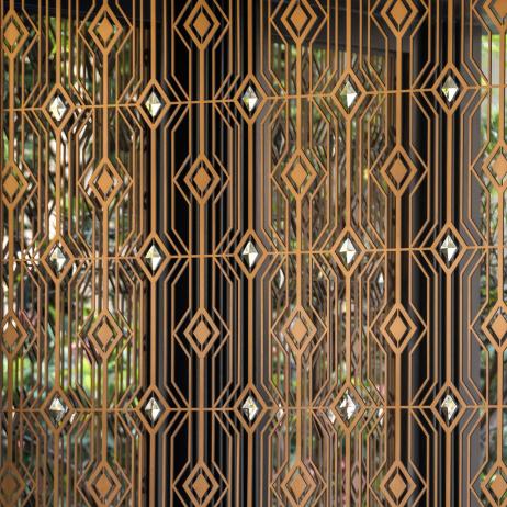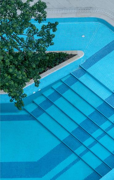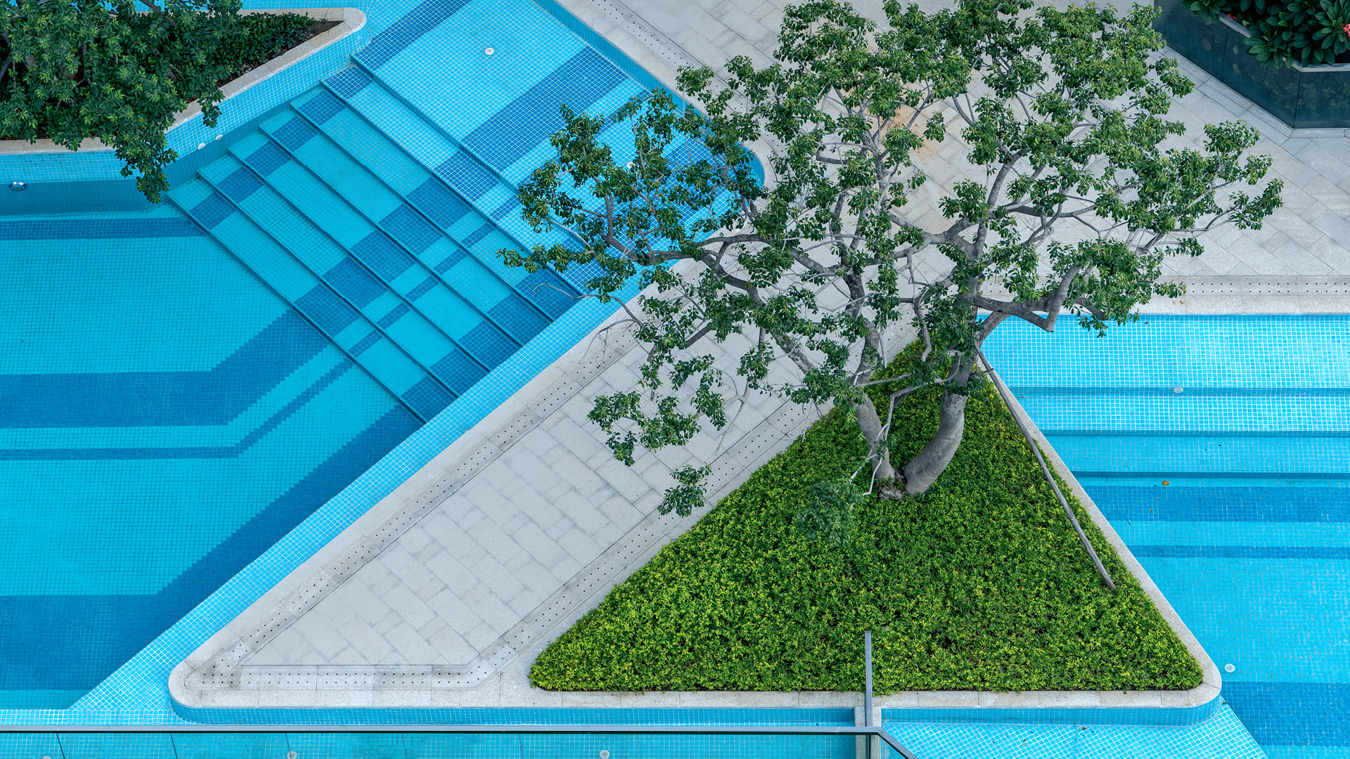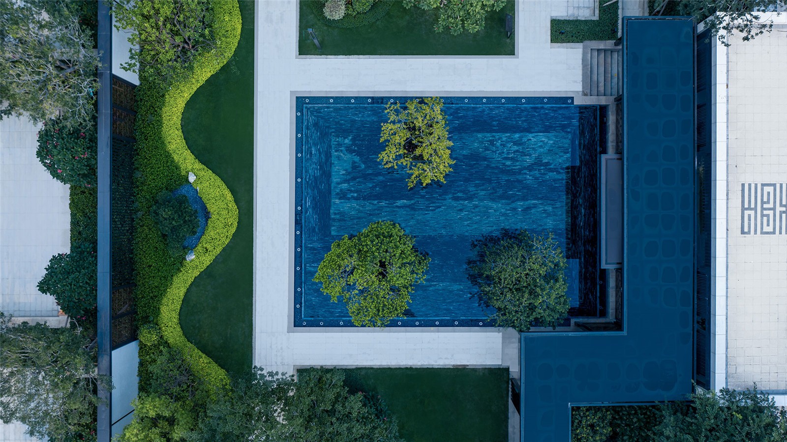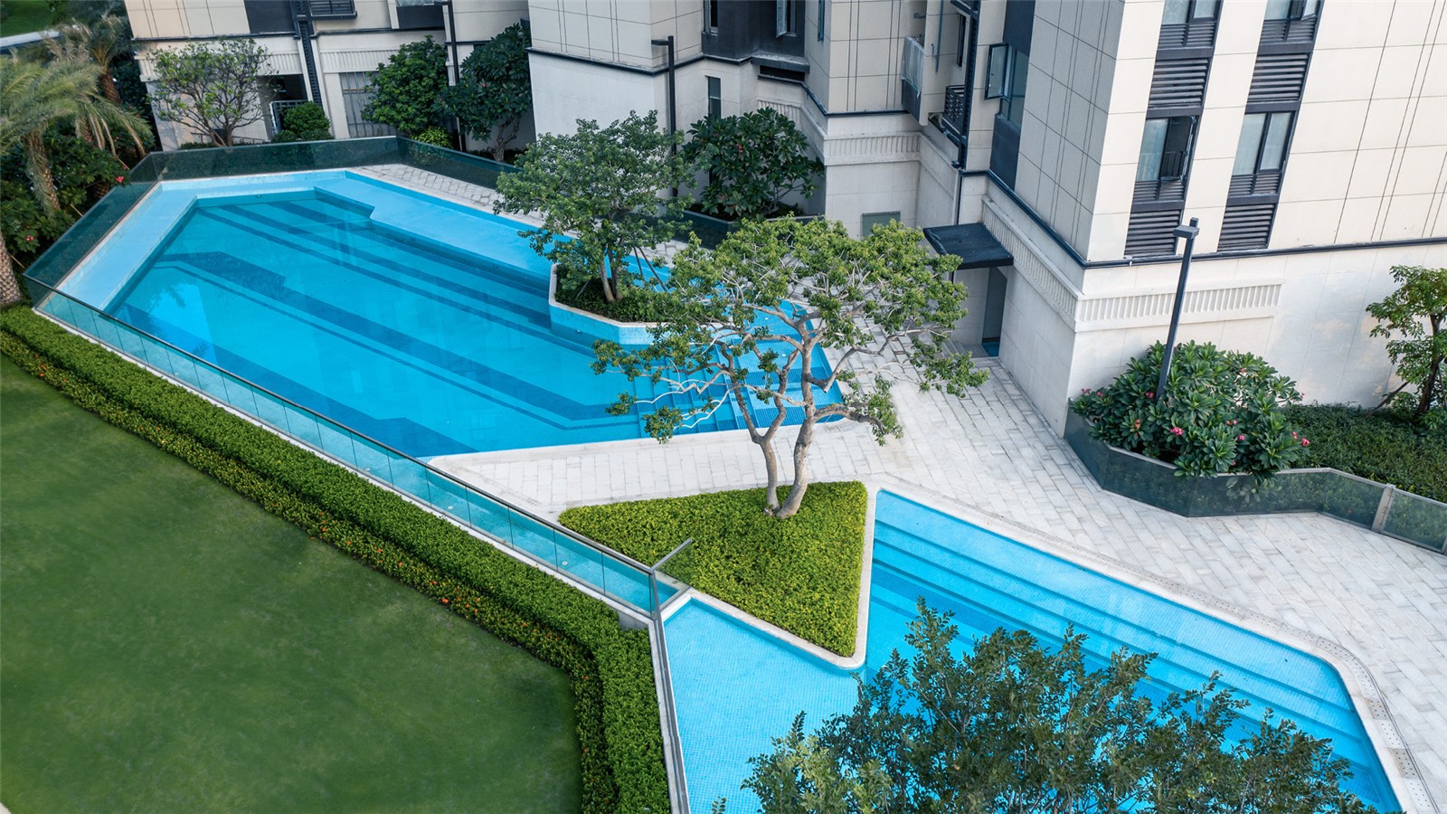 Considering the sunshine and monsoon’s impact on the site while continuing the beautiful connotation of diamonds, the designer derives his inspiration from diamond’s profile, shape, edge and line to form a geometric artful space. By doing so, the designer crafts a holiday-style swimming pool with the area of 420 square meters, providing the residents a cozy and pleasurable experience by mingling vacation enjoyment with high-end lifestyle.
