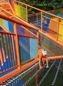 Given that children of different age present different sports and social demands, the designer builds complex leisure facilities which are available for climbing, crossing and jumping. In doing so, children can enjoy diverse activities ranging from hopscotch, balance beam, climbing nets, climbing tunnel to bongo.