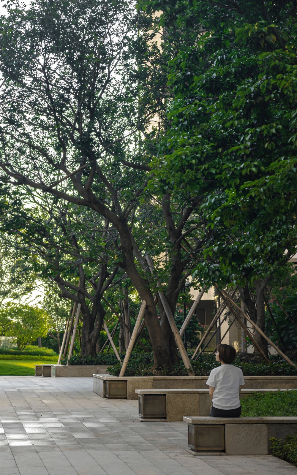 規(guī)整的中心廣場,12棵全冠樸樹與條凳有序排列,枝葉鋪滿天空,瞬間將林下空間的愜意抒發(fā)得淋漓盡致......一個(gè)有著濃郁生活氣息的社區(qū)空間躍然眼前。