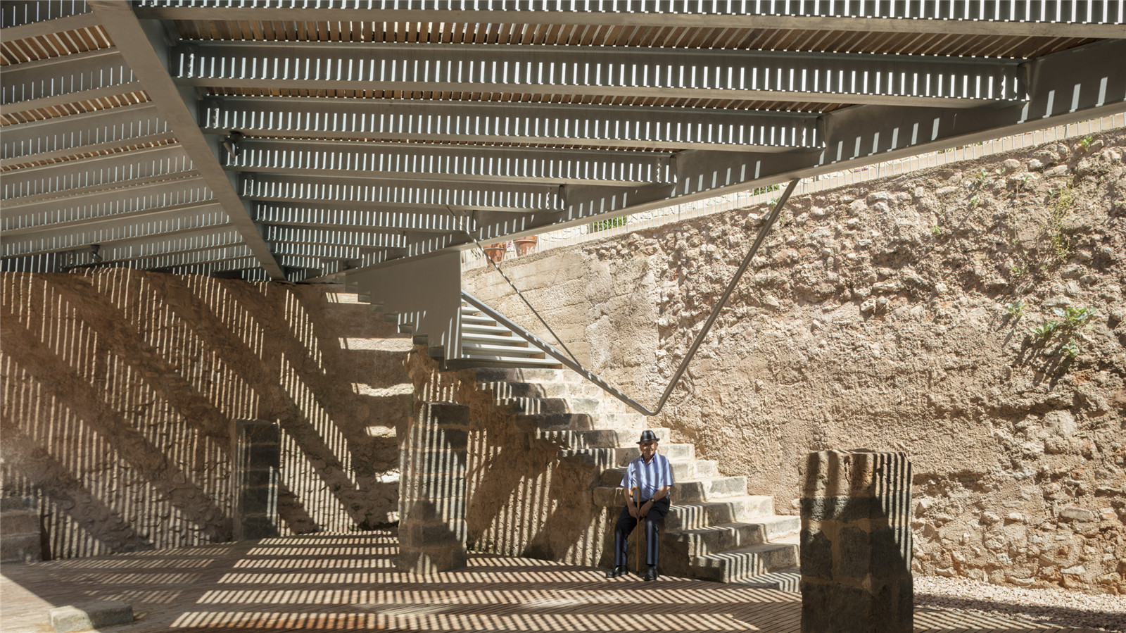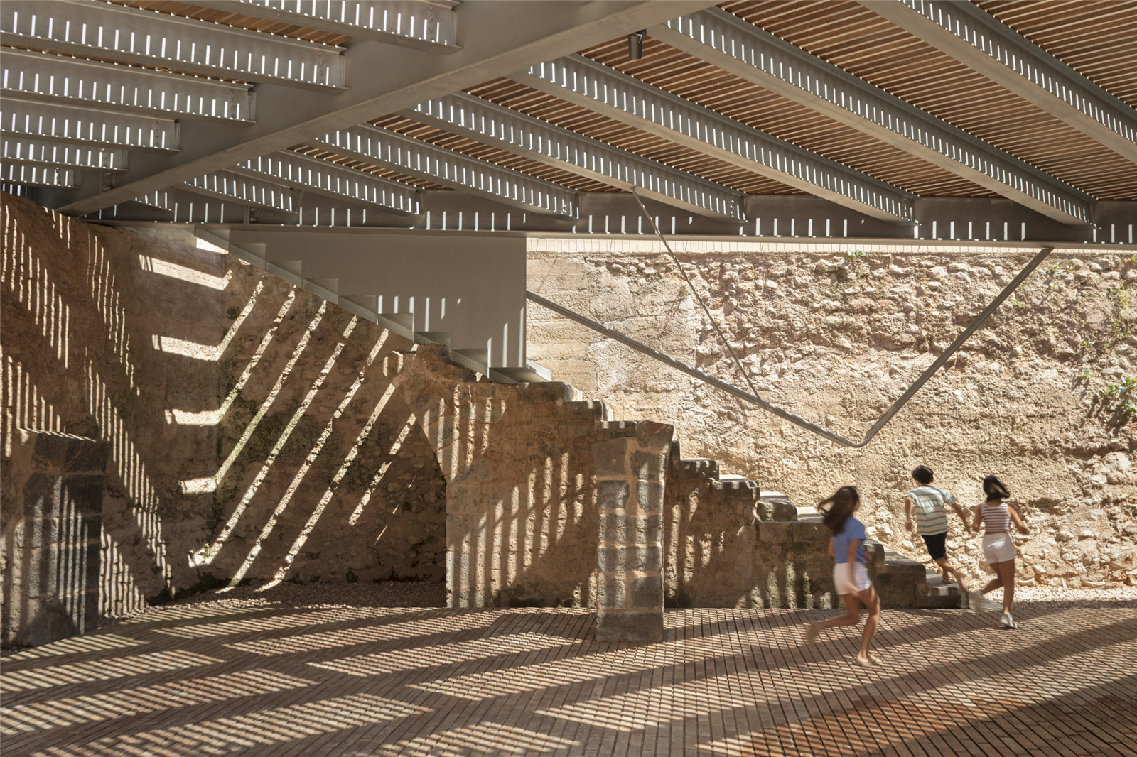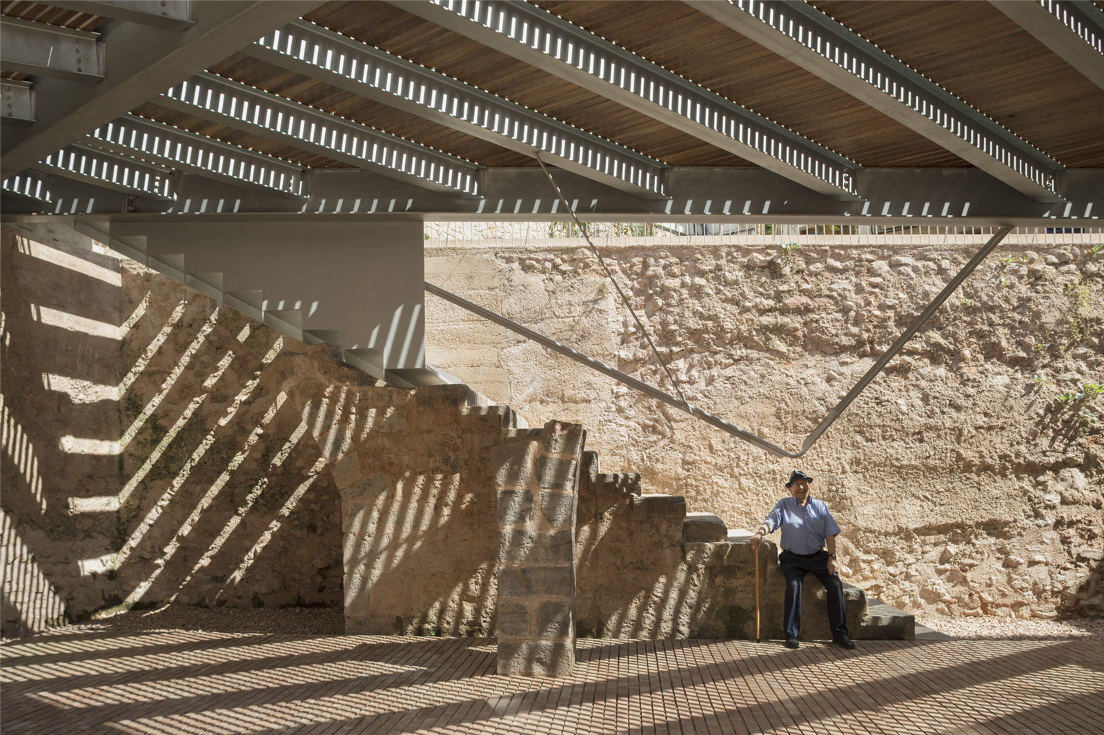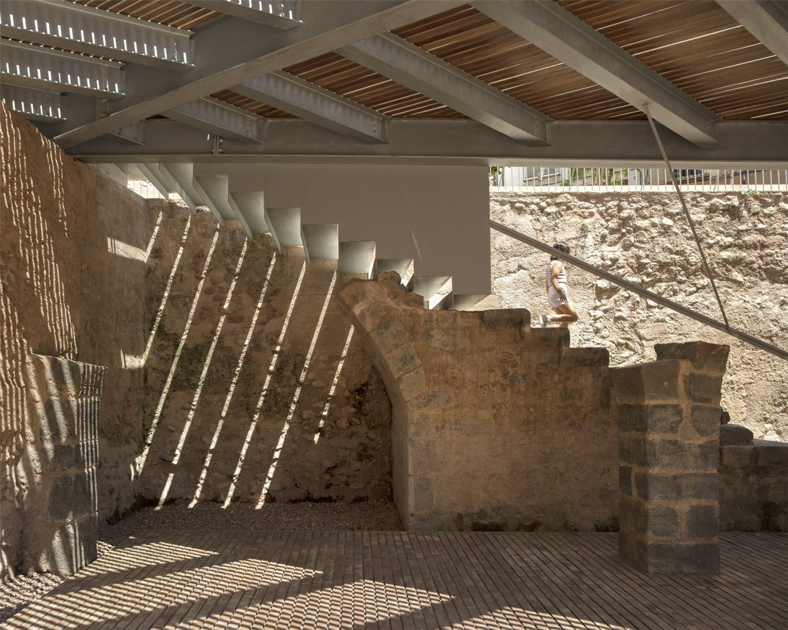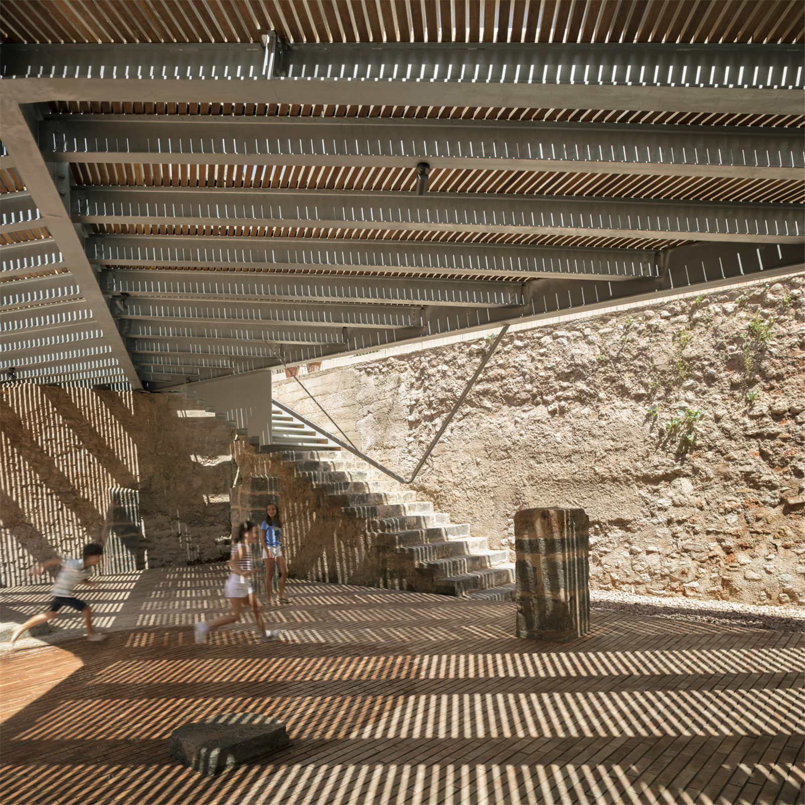 The historical Valencia Street had been lost when the archaeological area was opened up and disconnected from the historical center. A large wooden platform that adapts to the natural topography with steps, recovers this historic access road. The floating plaza is a continuity of the public space of the surrounding streets, which overflies the archaeological space. A floating pavement of iroko wood slats, with details of handcrafted placement, on a steel structure that allows it to adapt to the topography, through a gentle staggering of small steps to sit and chat. An urban space made of wood, friendly, that promotes the tactile sensation of small scale in urban spaces.