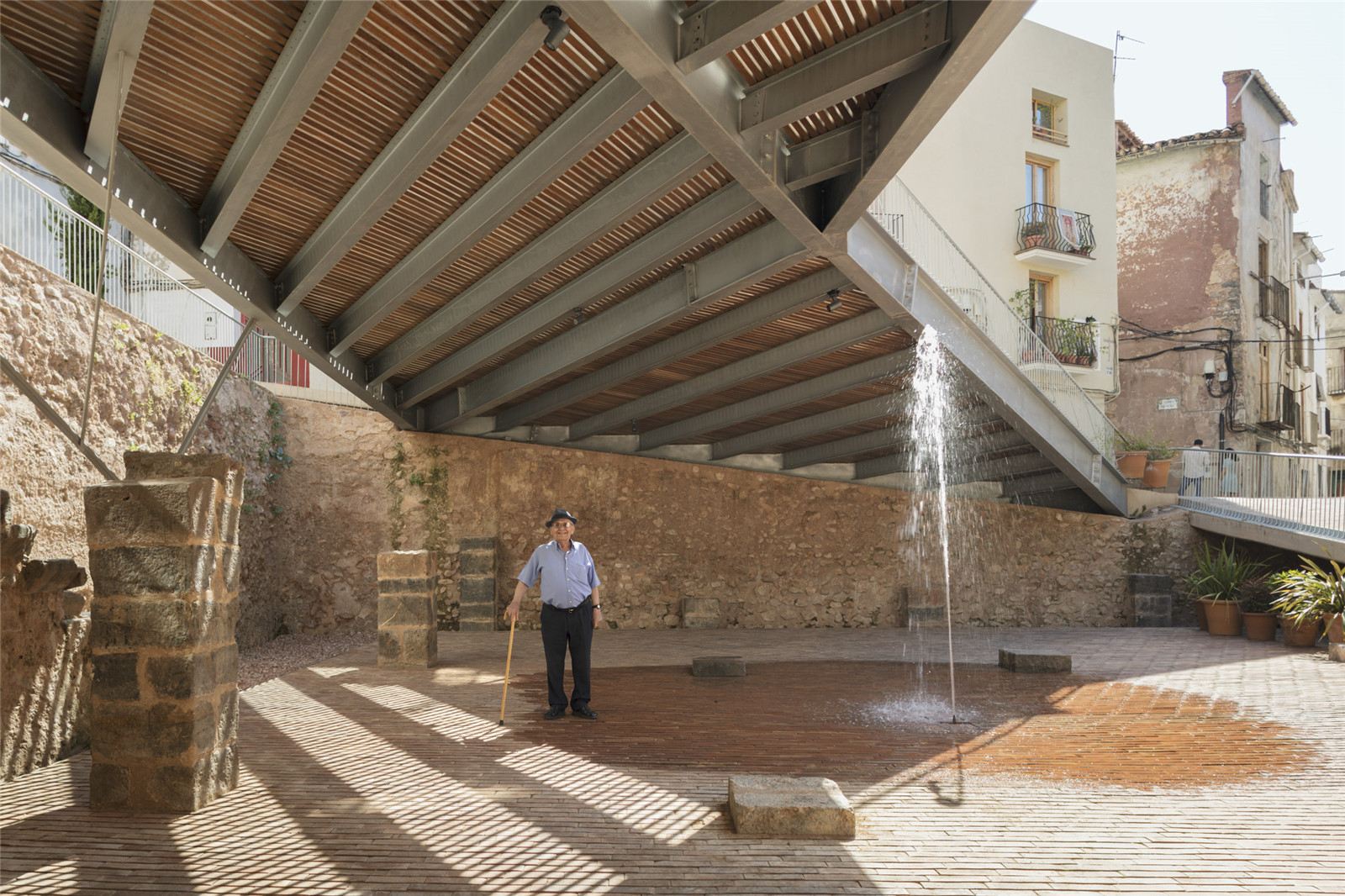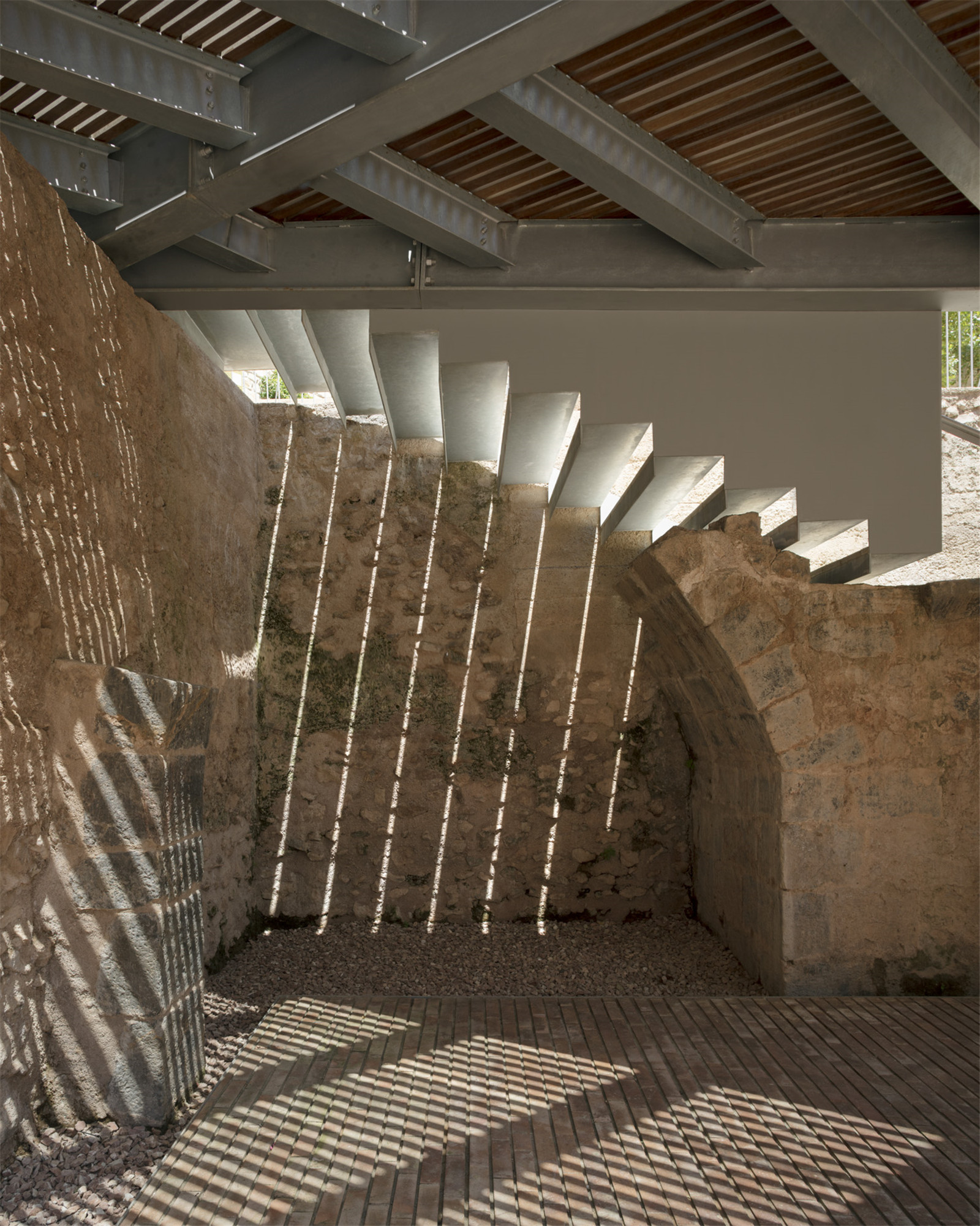 猶太教堂廣場位于西班牙翁達(dá)市歷史中心區(qū),作為伊斯蘭時期(s.XI-sXII)的重要文化遺產(chǎn),于1967年被正式列入遺產(chǎn)名錄。它位于中世紀(jì)老城區(qū)的一處地形復(fù)雜的空地,靠近中世紀(jì)阿拉伯宮殿和基督教堂遺址。歷史上這里曾是社交聚會的空間,后又曾作為農(nóng)業(yè)用地和校園操場。近幾十年來,廣場的功能僅限于停車場,致使空間品質(zhì)受損。2016年的一次考古發(fā)掘,讓埋藏在地下5米深處的中世紀(jì)石砌夯土圍墻,以及部分殘留的階梯和拱形壁柱重現(xiàn)天日,這成為啟動城市更新和遺產(chǎn)保護(hù)項目的契機(jī)。