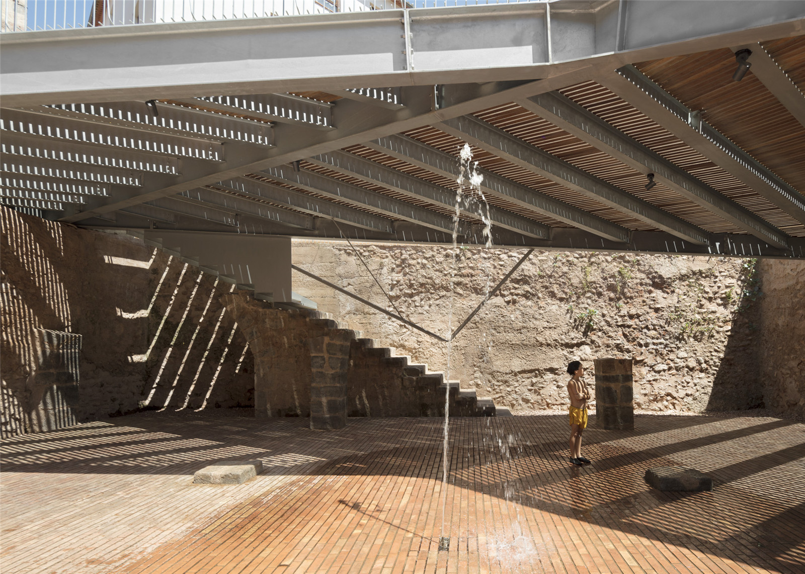 ▼下沉的考古遺址成為兒童玩耍的空間