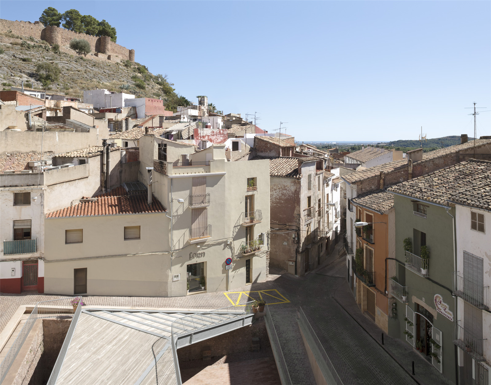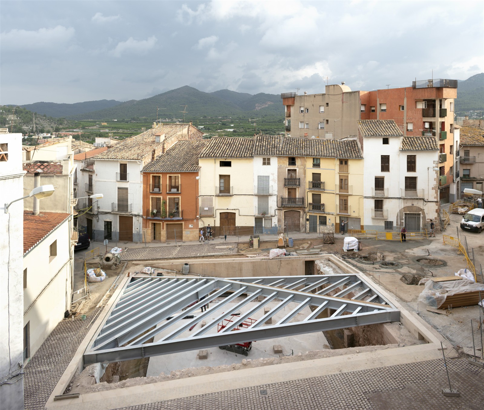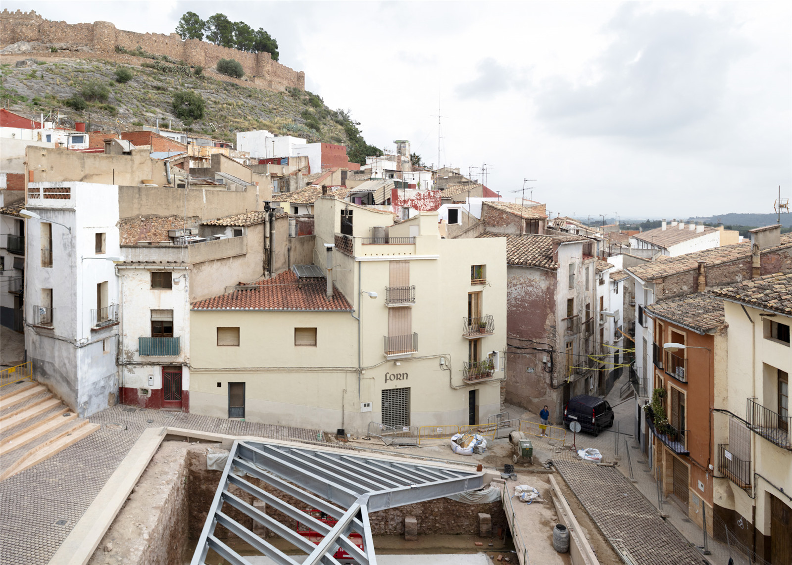 The project is an urban regeneration and heritage intervention, located in the Historical City Center of Onda, from de Islamic period (s.XI-sXII) declared as a Monument of Significant Cultural Interest with the Monument category in 1967. The square is a void in the medieval city, in a topographic area, close to the archaeological rests of arabic medieval palaces and the Chistian Church. This square was a social meeting space in the past, for agriculture uses or as a playground of a children’s school. But in the last decades was used only as a parking lot, degradating the quality of the space. In 2016, during an archeological research, an enclosure of medieval rammed earth walls reinforced with stones and the rests of a stair and pilasters of arches were discovered 5 meters deep in the ground.