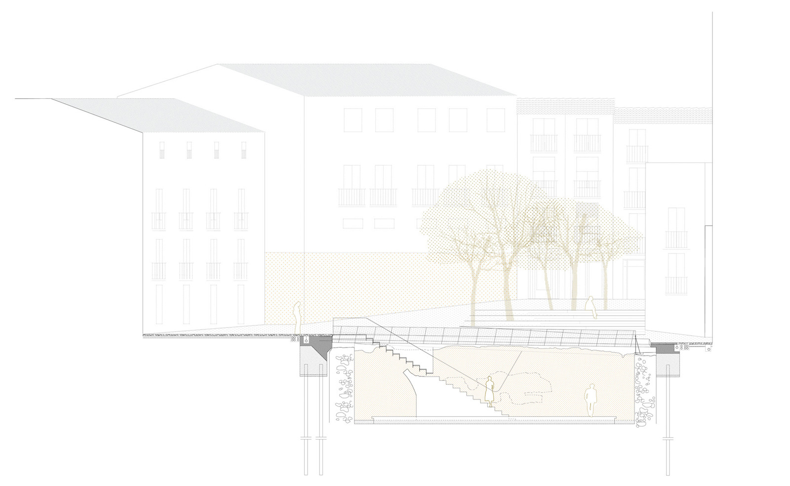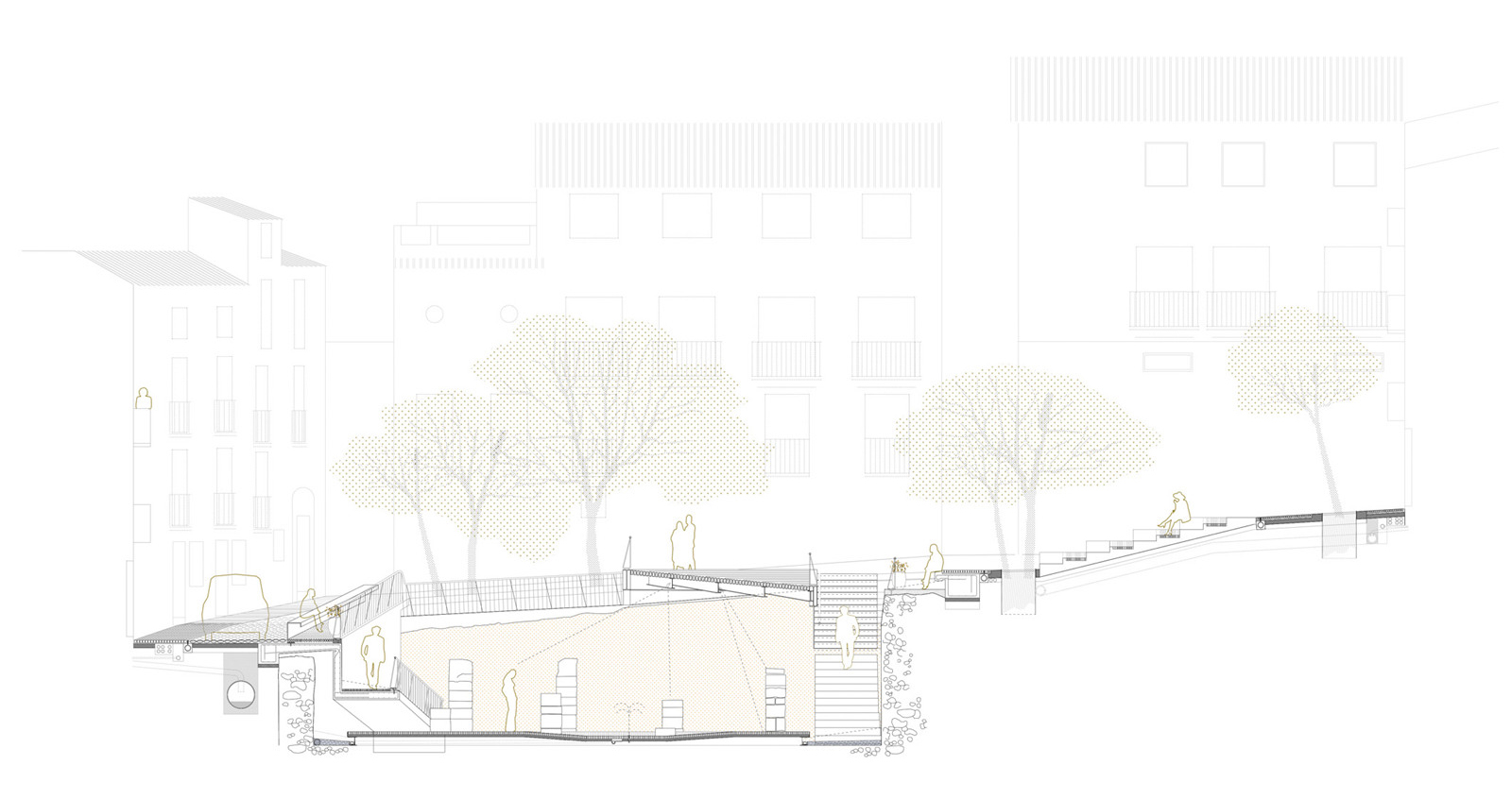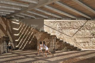 考古發(fā)現(xiàn),廣場上曾有一處15米見方的圍合空間,中央是一艘安達(dá)盧西亞木筏,四周有1.4米厚的石墻。13-14世紀(jì)的醫(yī)院騎士團(tuán)統(tǒng)治時期,人們還在這里建造了與周邊民居或宗教建筑相連接的四排石拱門和一座哥特式階梯。本案希望幫助周邊人口顯著減少的社區(qū)恢復(fù)吸引力和公共生活,將考古遺址與廣場的其他部分相融合,重新建立與街道的交通聯(lián)系,畢竟在多年的考古發(fā)掘過程中,這里是一座封閉的孤島。