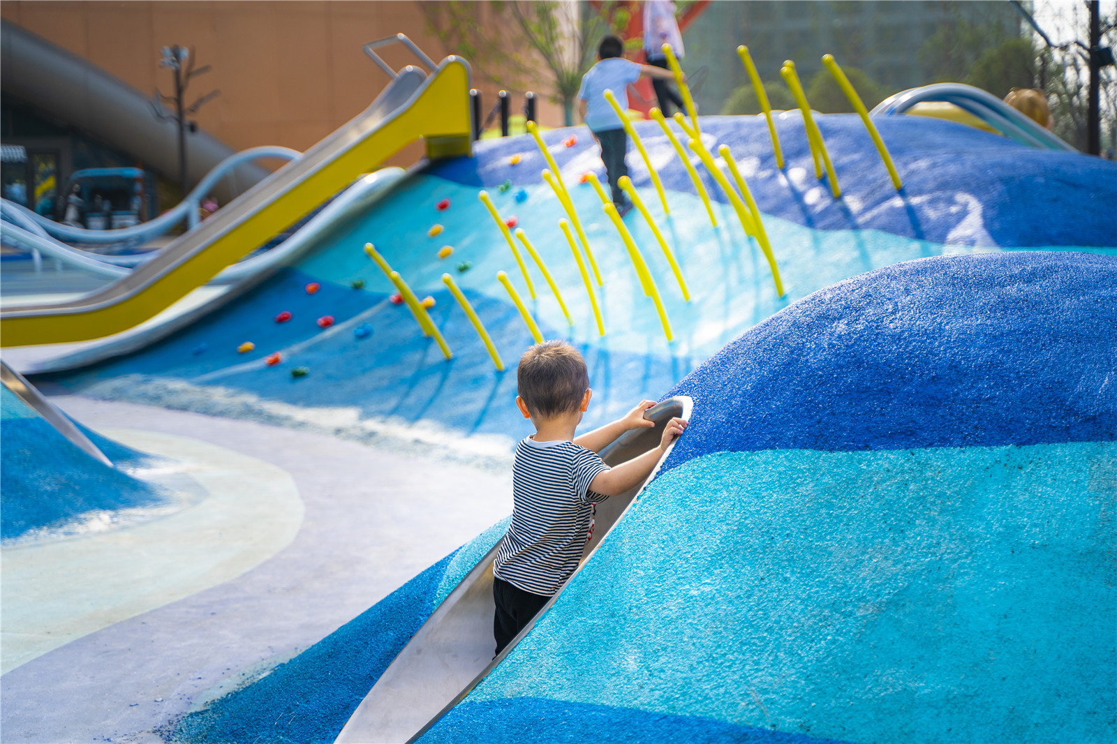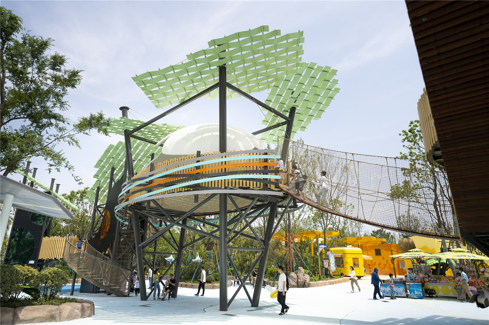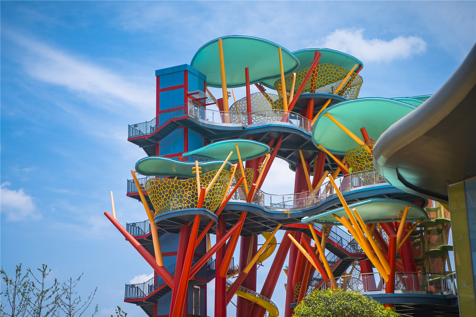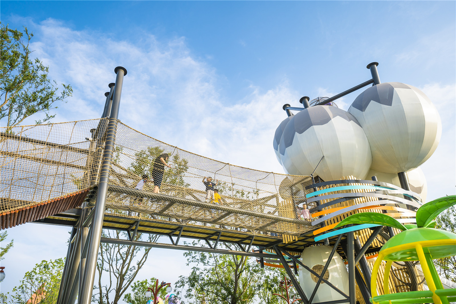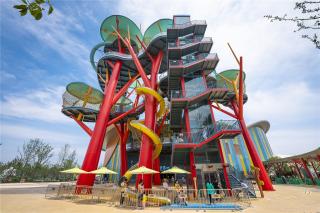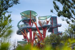 直達(dá)頂點(diǎn)處,解鎖全新觀景視角。這個(gè)高32.5m搭配玻璃棧道的觀景平臺(tái),懸掛著反重力規(guī)律;鏈接到二層建筑的超長滑梯,宛如進(jìn)入童話世界的“森林部落”。