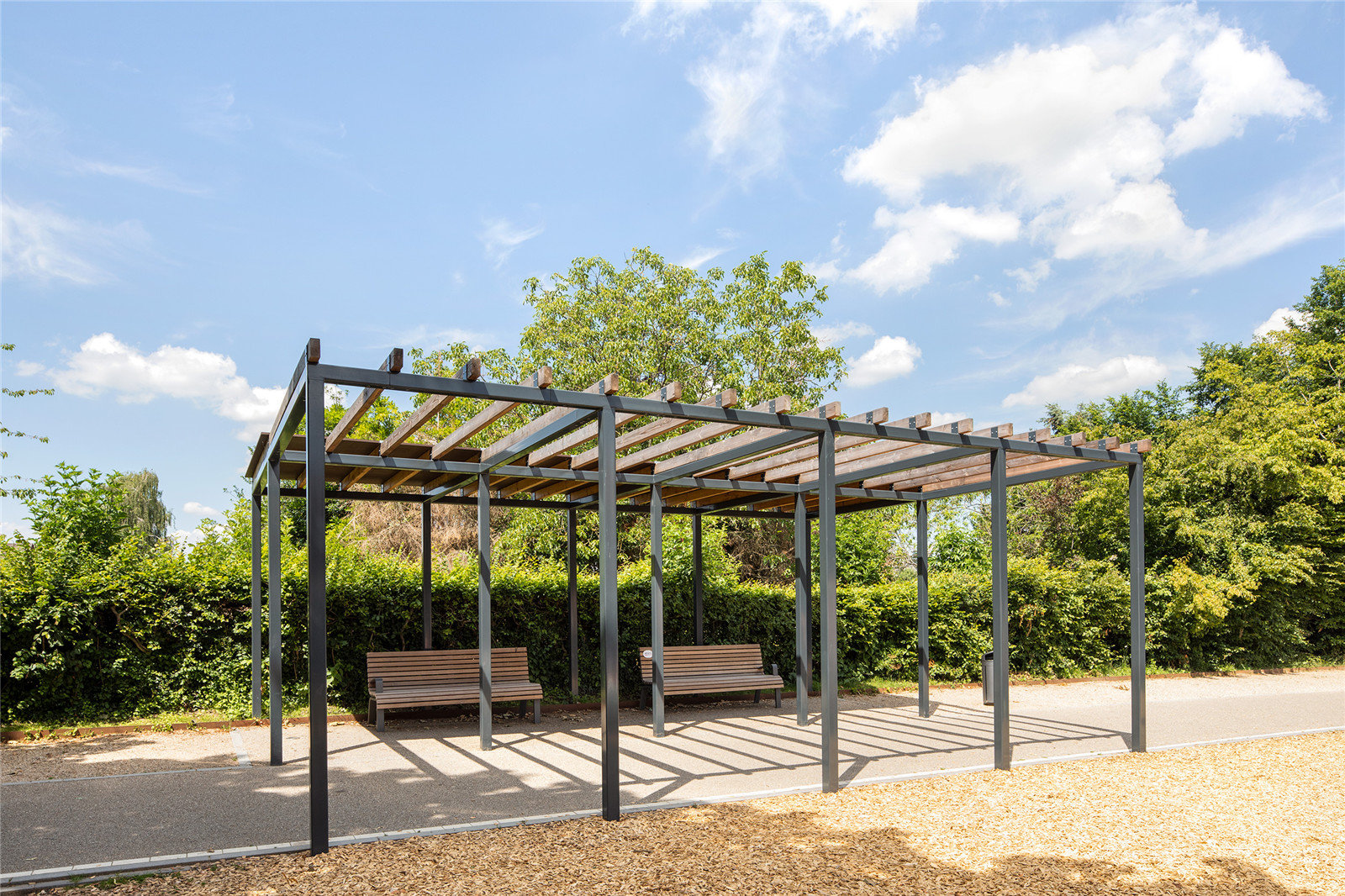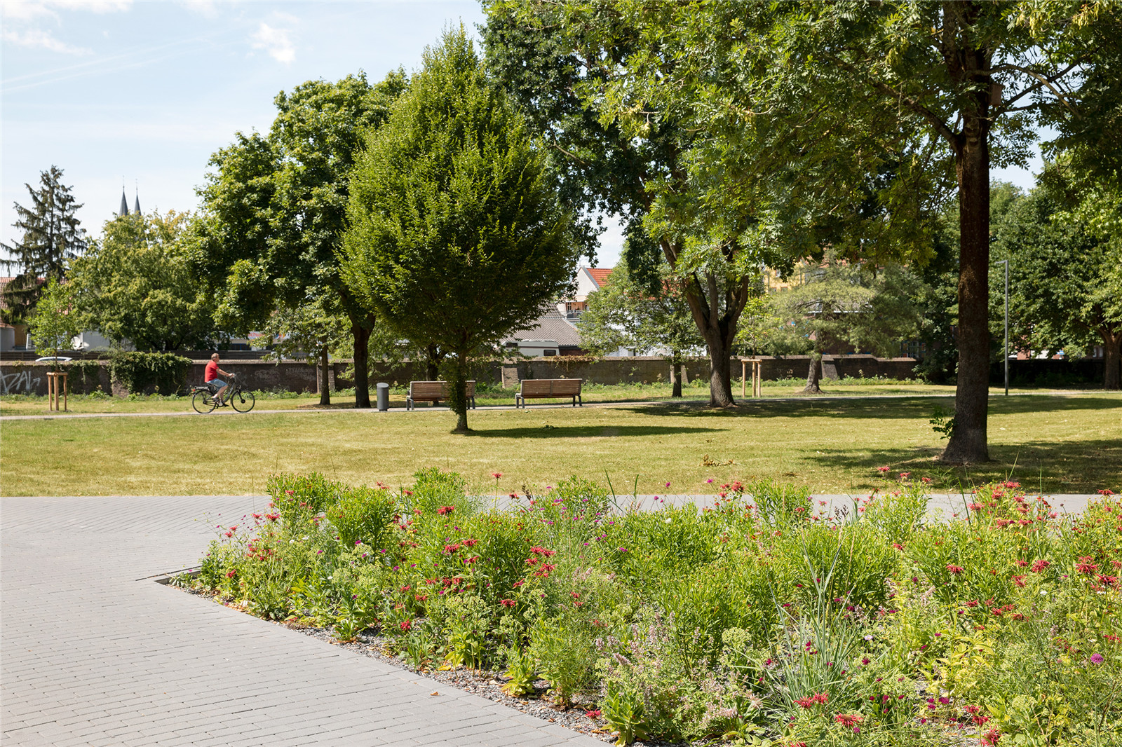 The green areas are traversed by a hierarchical path system, which we partially re-arranged and adapted in the course of the re-design. The planting of perennials accentuate the access to the park, from which the main path can always be reached. The barrier-free circular route, which is paved with mastic asphalt and is illuminated, connects all areas and crosses all access paths via traffic-calming narrowing. Numerous benches ranged alongside the circular route offer seating during a stopover. The Northern Wall area is equipped with three pergolas emphasizing distinct resting places offering a great view towards the gabled houses, the Kriemhild mill and the new dragon sculpture.