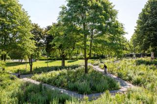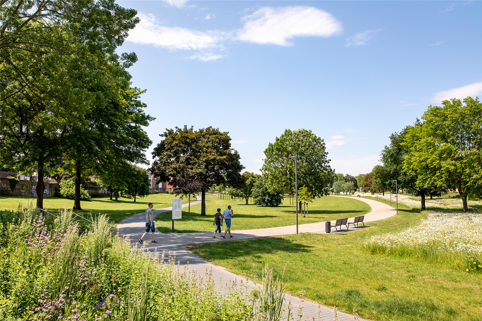 The park is characterized by generous grass and meadow areas planted with groups of trees, single trees and shrubs. We have partially opened the structures and dimensions of the rampart to better integrate it within the park. Alongside the Bundesstra?e 57 and lengthways the Eastern Wall, the existing trees were supplemented with a free-growing hedge of lower shrubs.