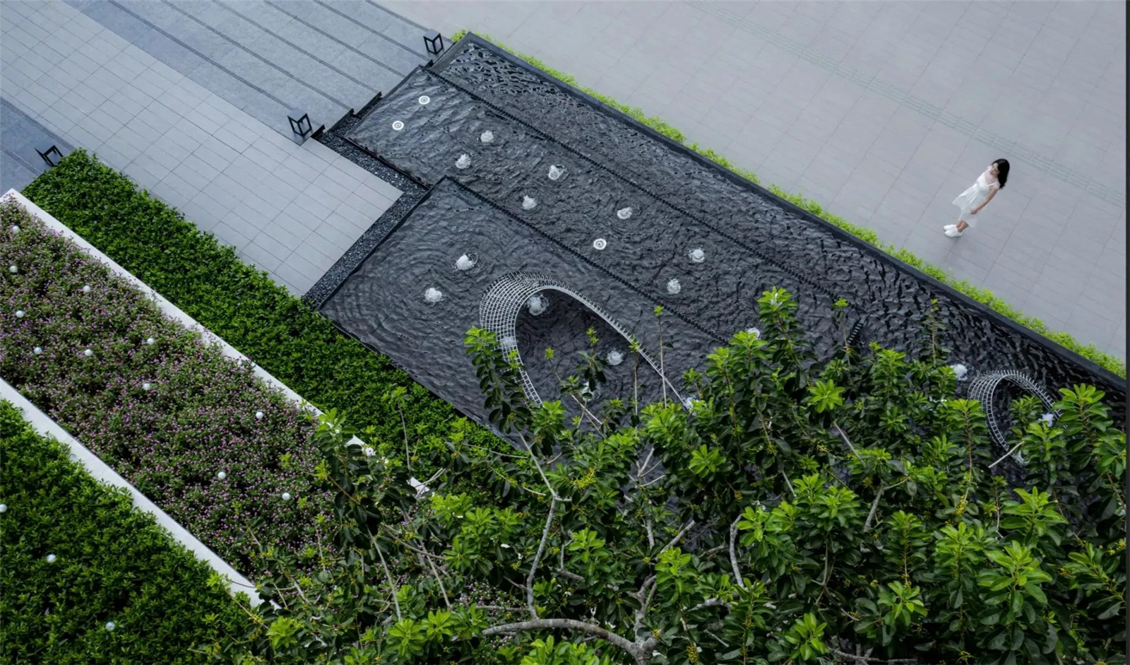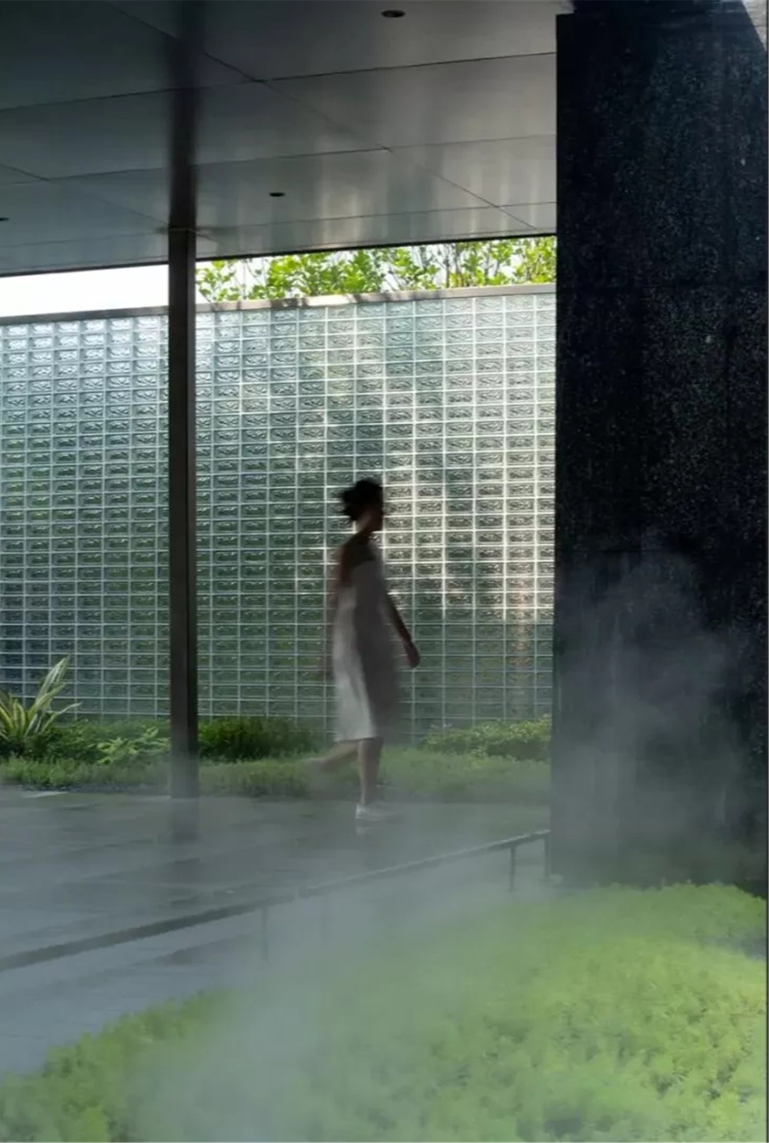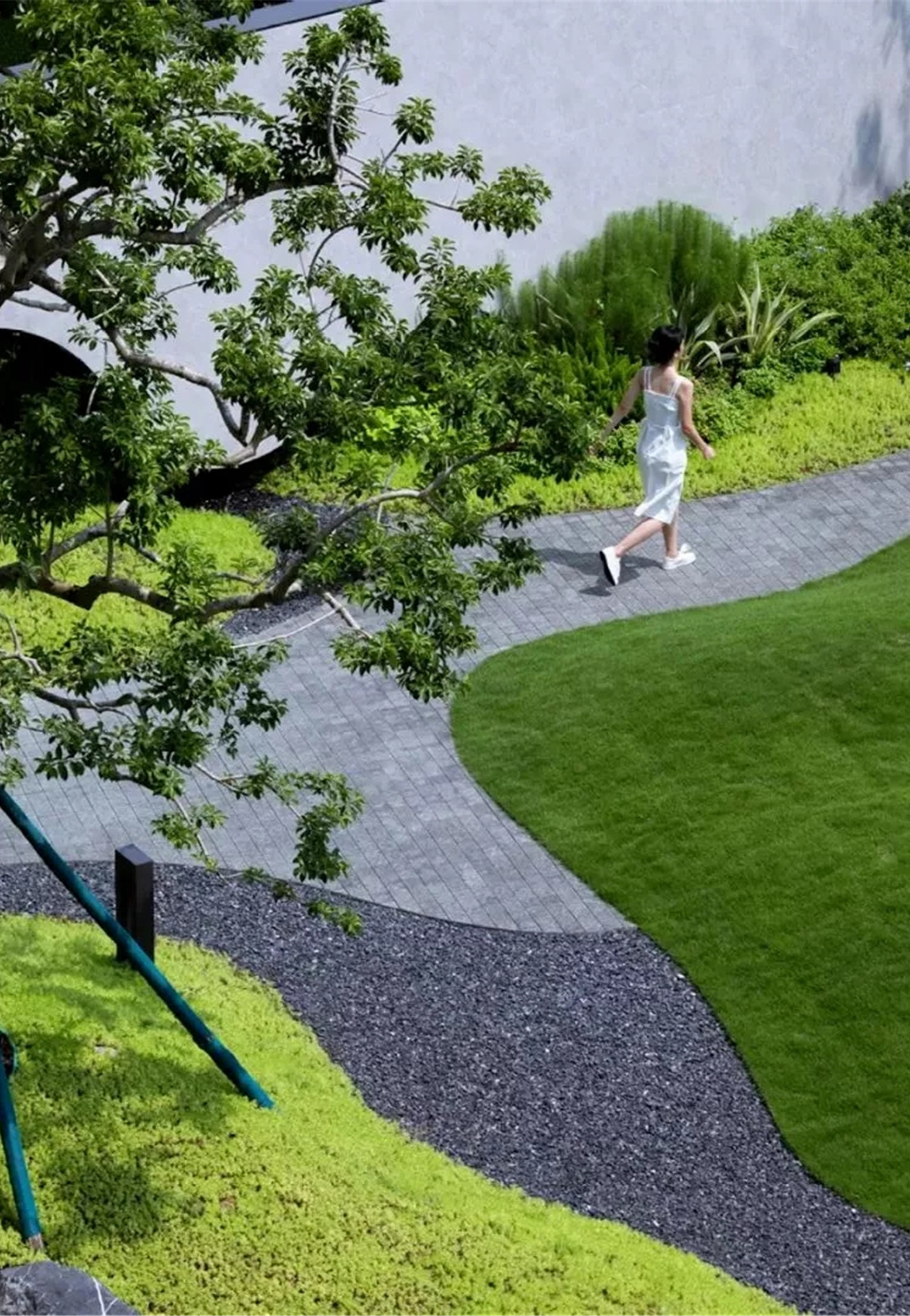 云的姿態(tài)是柔軟舒適的,設(shè)計中以云海為創(chuàng)造靈感,用起伏的地形營造院落中舒適飄逸的意境,互相交織的礫石和步道,如同刺穿云海中纏繞串聯(lián)的流光,相互滲透,形成一方靈動的藝術(shù)空間。