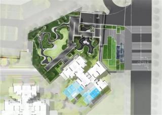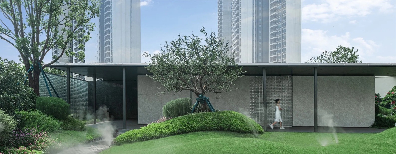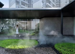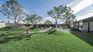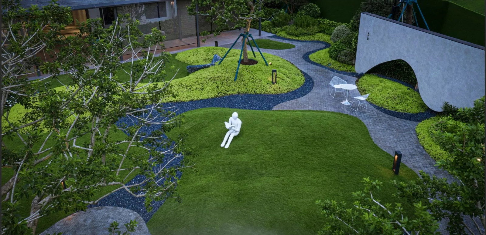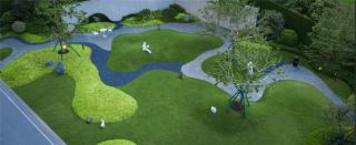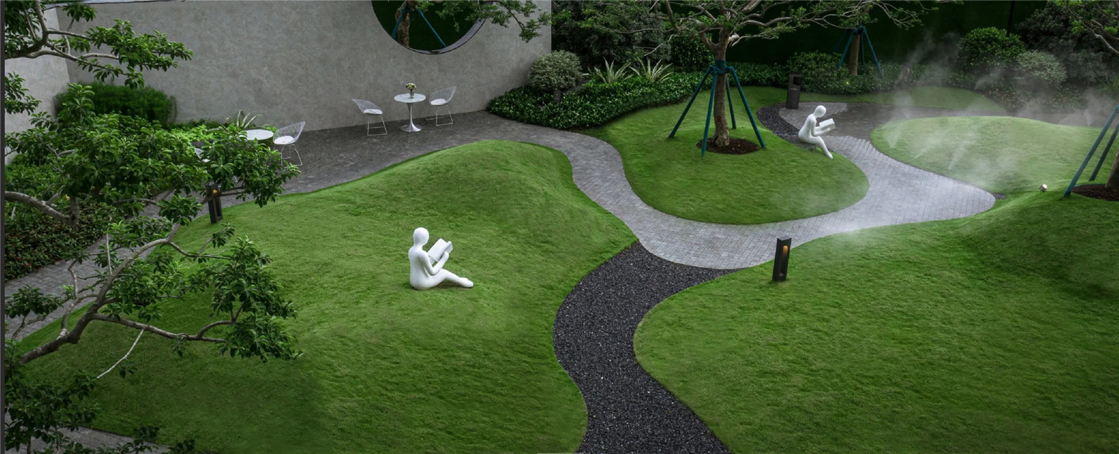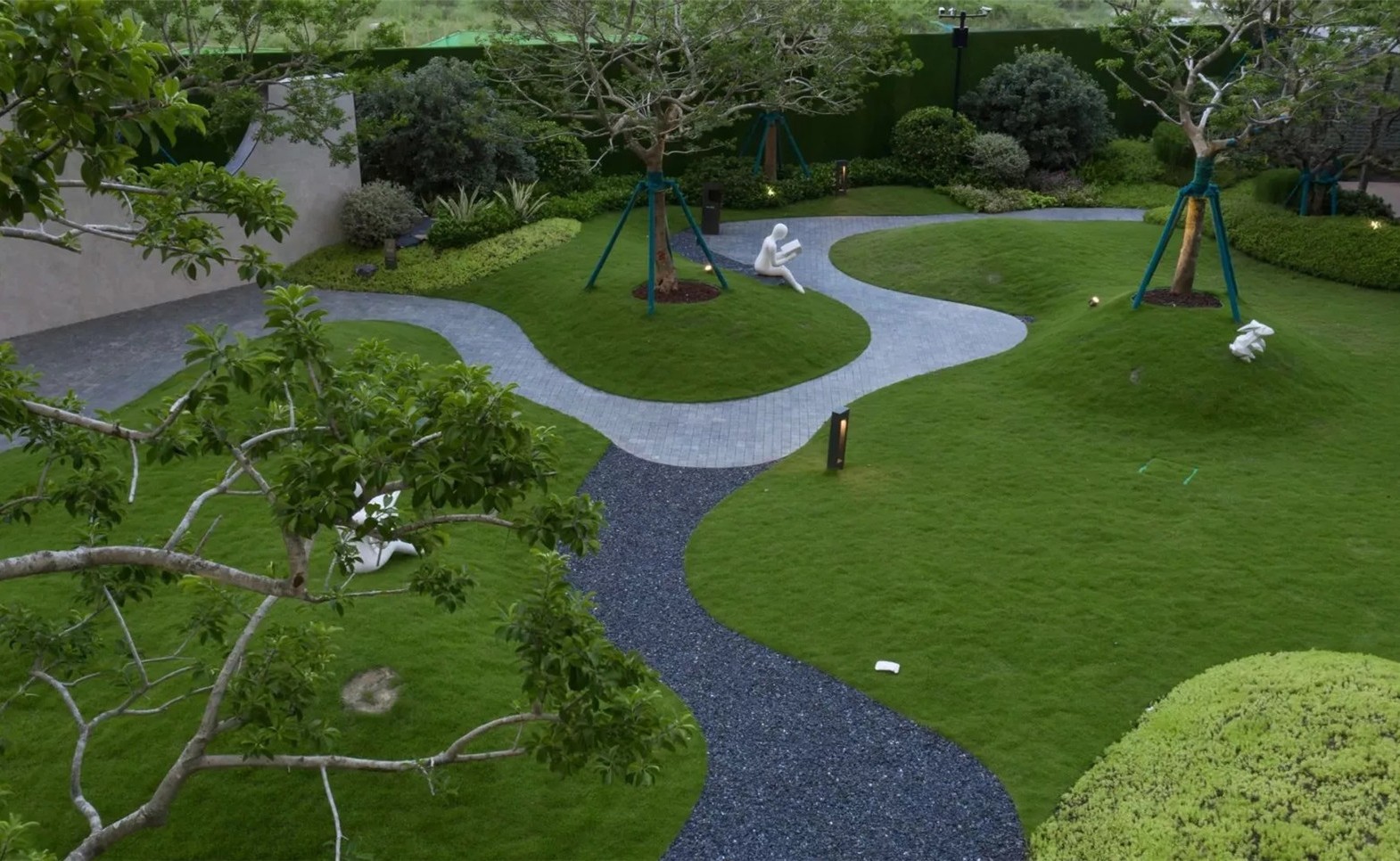 云的姿態(tài)是柔軟舒適的,設(shè)計中以云海為創(chuàng)造靈感,用起伏的地形營造院落中舒適飄逸的意境,互相交織的礫石和步道,如同刺穿云海中纏繞串聯(lián)的流光,相互滲透,形成一方靈動的藝術(shù)空間。