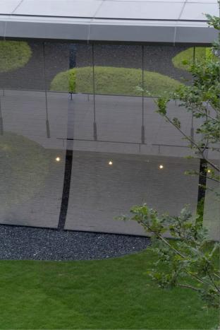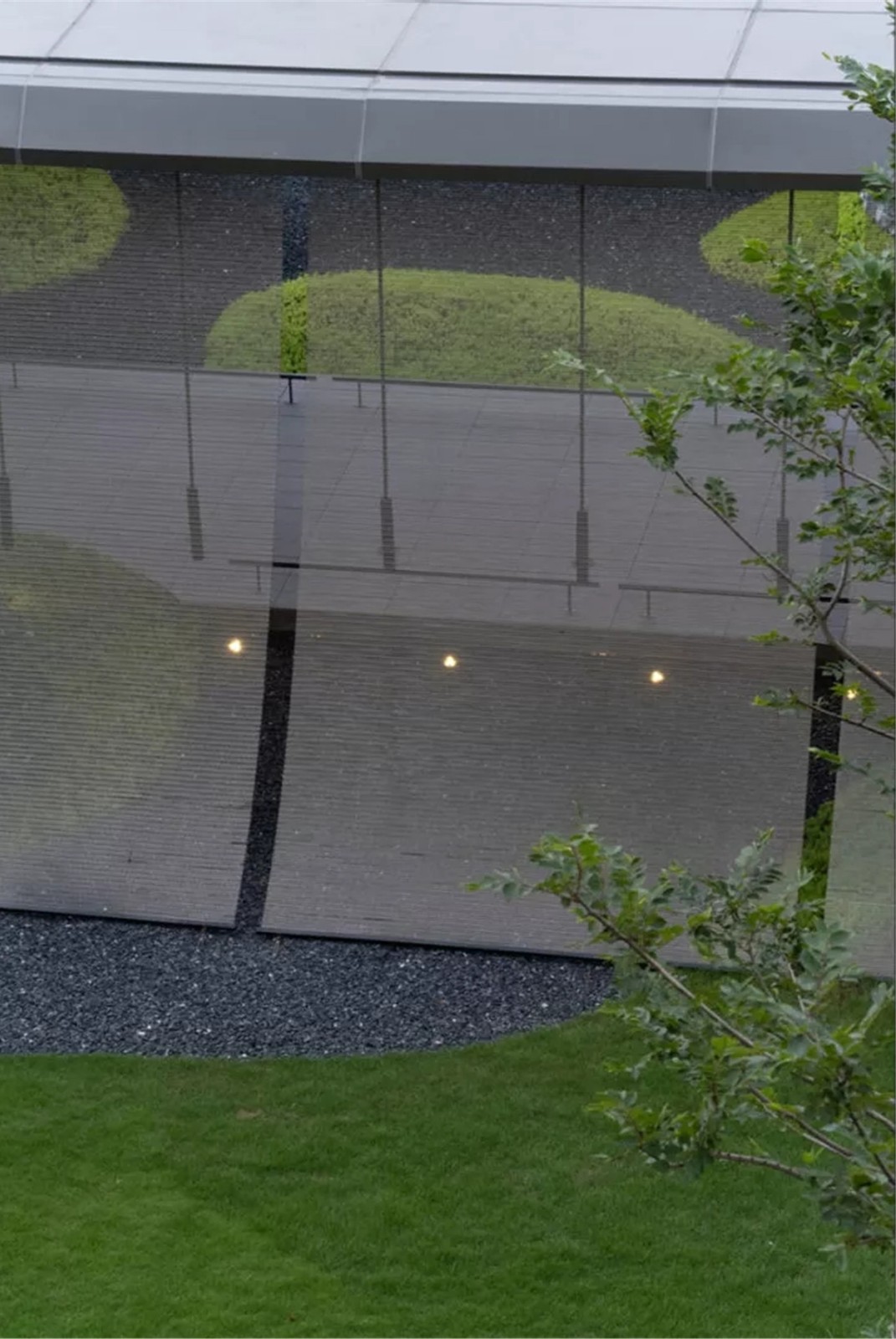 斜光到曉穿朱戶,晨光破曉,穿入門戶,帶來別致的美感.在設(shè)計上映襯內(nèi)外部之間聯(lián)系,讓自然滲透,遠遠望去,就像是 被云遮擋的陽光微微透露,在不同光影的變化之下,以藤朧的 形態(tài)對話外界的自然。
