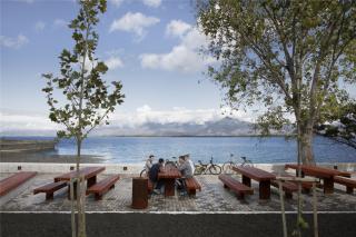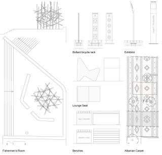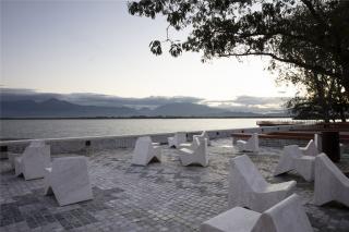 “阿爾巴尼亞地毯廣場”項(xiàng)目不僅是對希羅卡濱湖景觀進(jìn)行外觀與功能上的重建,還希望重塑人們對公共空間的歸屬感和連接感。項(xiàng)目設(shè)計的靈感來源于阿爾巴尼亞的傳統(tǒng)民居樣式:不同的開放式房間組成一幢大房屋,尤以長條U型凳為其顯著特色,可供家庭成員坐、躺、甚至小憩。這些“房間”能欣賞到湖面的開闊景致,也激發(fā)了人們對空間的多樣化使用,比如作為游樂室、野餐室、休息室、露天劇場或漁夫屋等。