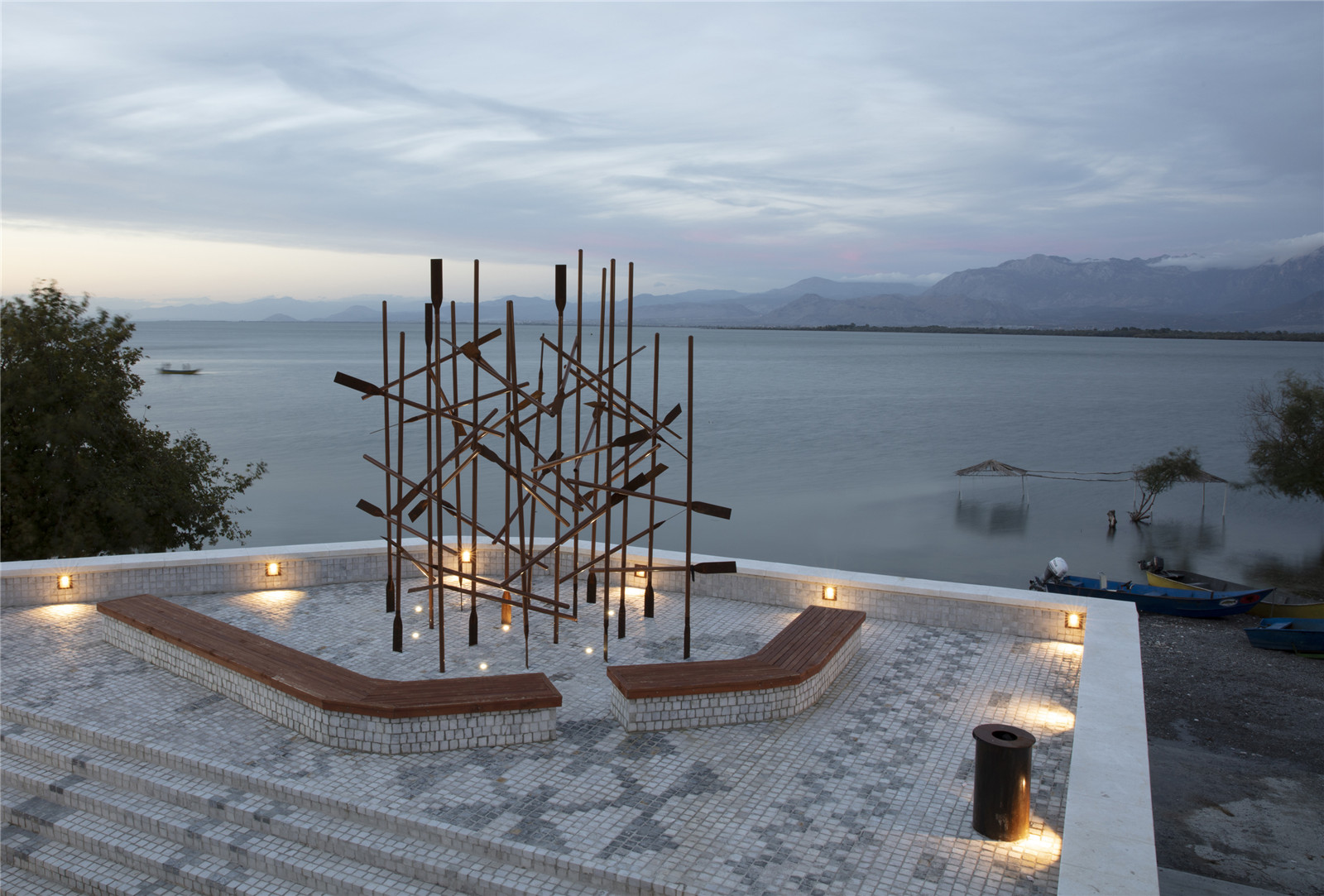 Shiroka is a fishing village located on the shores of Shkodra Lake, near the border with Montenegro. Its inhabitants lived for centuries from the lake, men fishing with small rowboats and women tending orchards and weaving carpets by hand. The reaction to the end of a communist regime that had deprived citizens of living from traditional “private” activities was widespread mistrust in the public sphere, which led to a period characterized by uncontrolled occupation and privatization of public space. As result, the public space of the waterfront of Shkodra lake was occupied with illegal constructions such as private houses, restaurants, private parking areas, and kiosks. “Albanian Carpet” returns the waterfront to the citizens demolishing the illegal constructions, opening the views over the lake, and creating an alive public space with a domestic character.