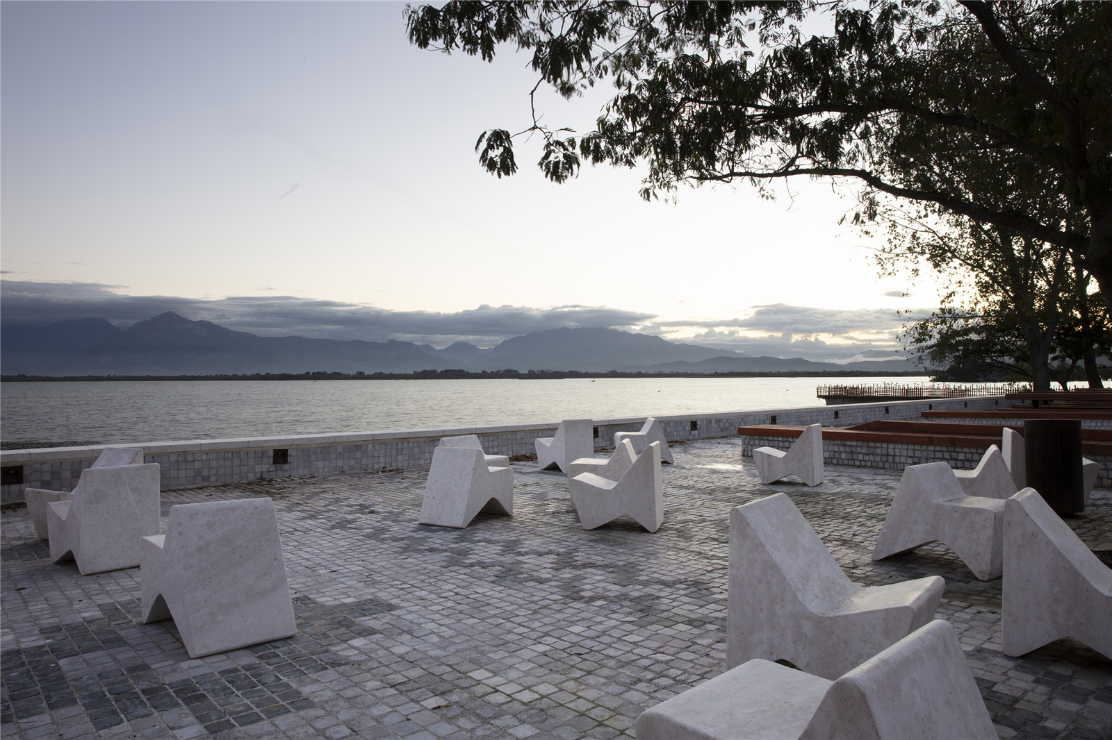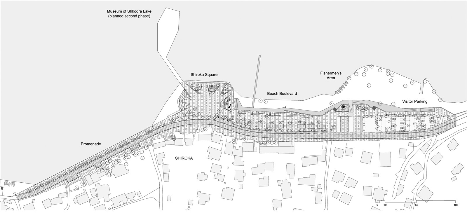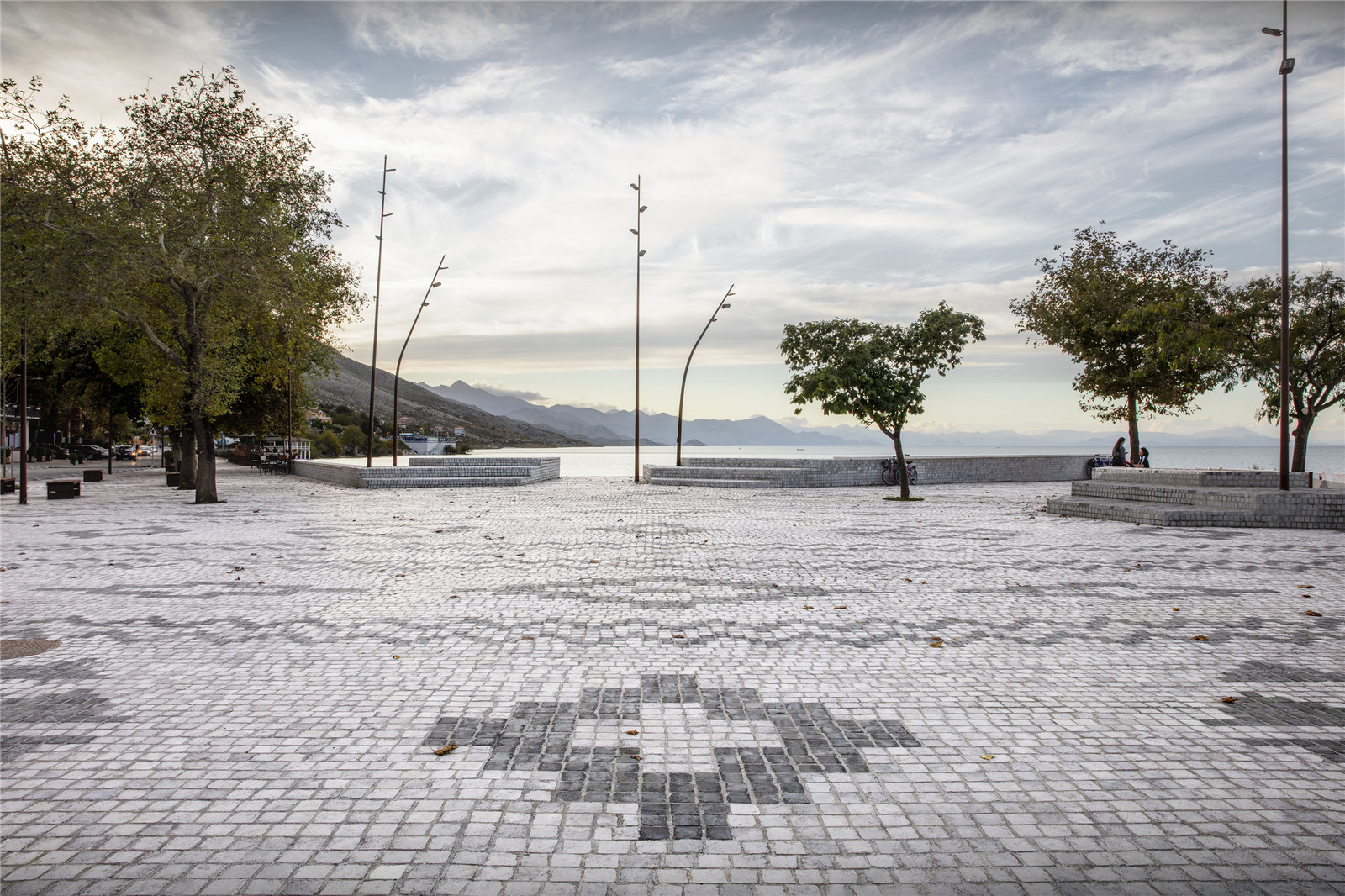 希羅卡漁村坐落在斯庫臺湖畔,毗鄰黑山。幾個世紀(jì)以來,當(dāng)?shù)鼐用穸寂R湖而居,男人們劃著小船外出捕魚,女人們則在家照料果園,編織手工地毯。原先的共產(chǎn)主義政體破壞了傳統(tǒng)“私人式”的生活生產(chǎn)方式,最后以廣泛彌漫在公眾中的信任危機(jī)為終結(jié),隨后便進(jìn)入一段失控的私有化與侵占公共空間的時期。由此,斯庫臺湖濱水區(qū)的公共空間被私人住宅、餐廳、私人停車場與售賣亭等非法建筑所占據(jù)?!鞍柊湍醽喌靥簭V場”清退了非法建筑物,開拓了湖面的景觀視野,打造出具有地域特色的公共活力空間,將湖濱區(qū)再次變?yōu)槿窆蚕怼?/p>