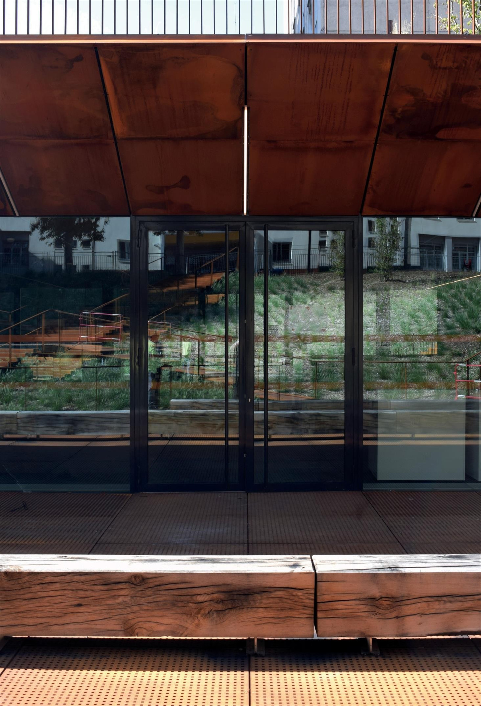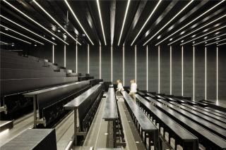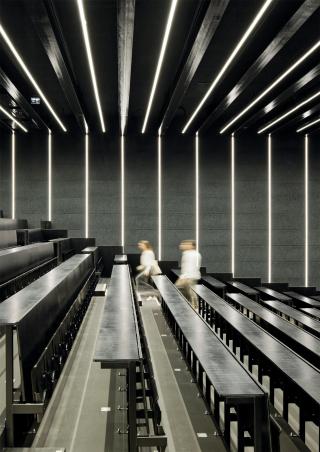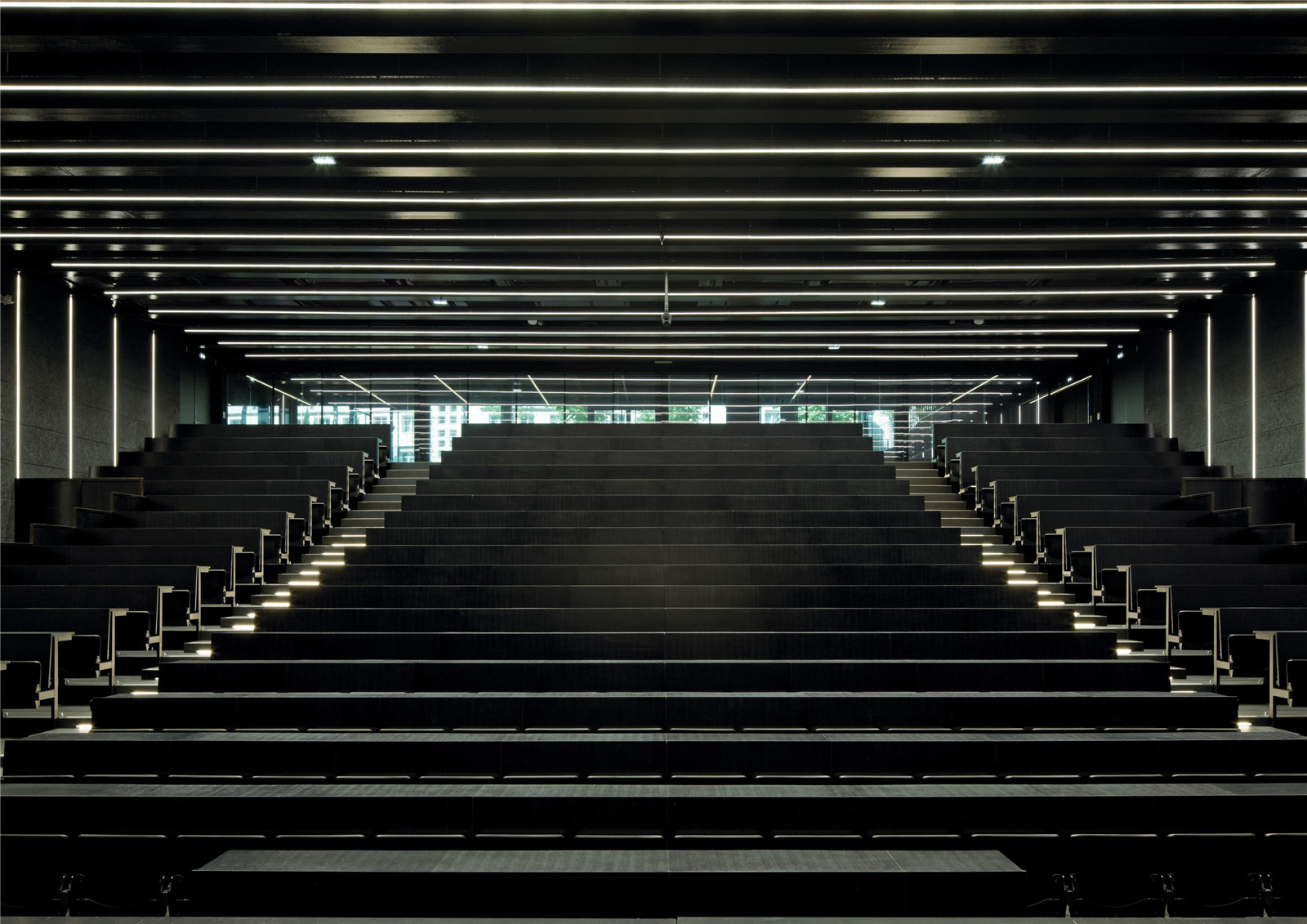 坐擁500個座位的階梯教室是露爾辛校區(qū)的主要特色。它位于閱兵場的最低點,也就是舊停車場的位置,且沿著南北軸線方向。劇場由完全覆蓋了自耐候鋼的走廊接入,使得中央廣場的連續(xù)性得以延伸。