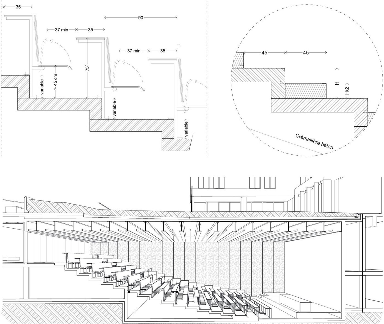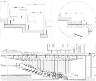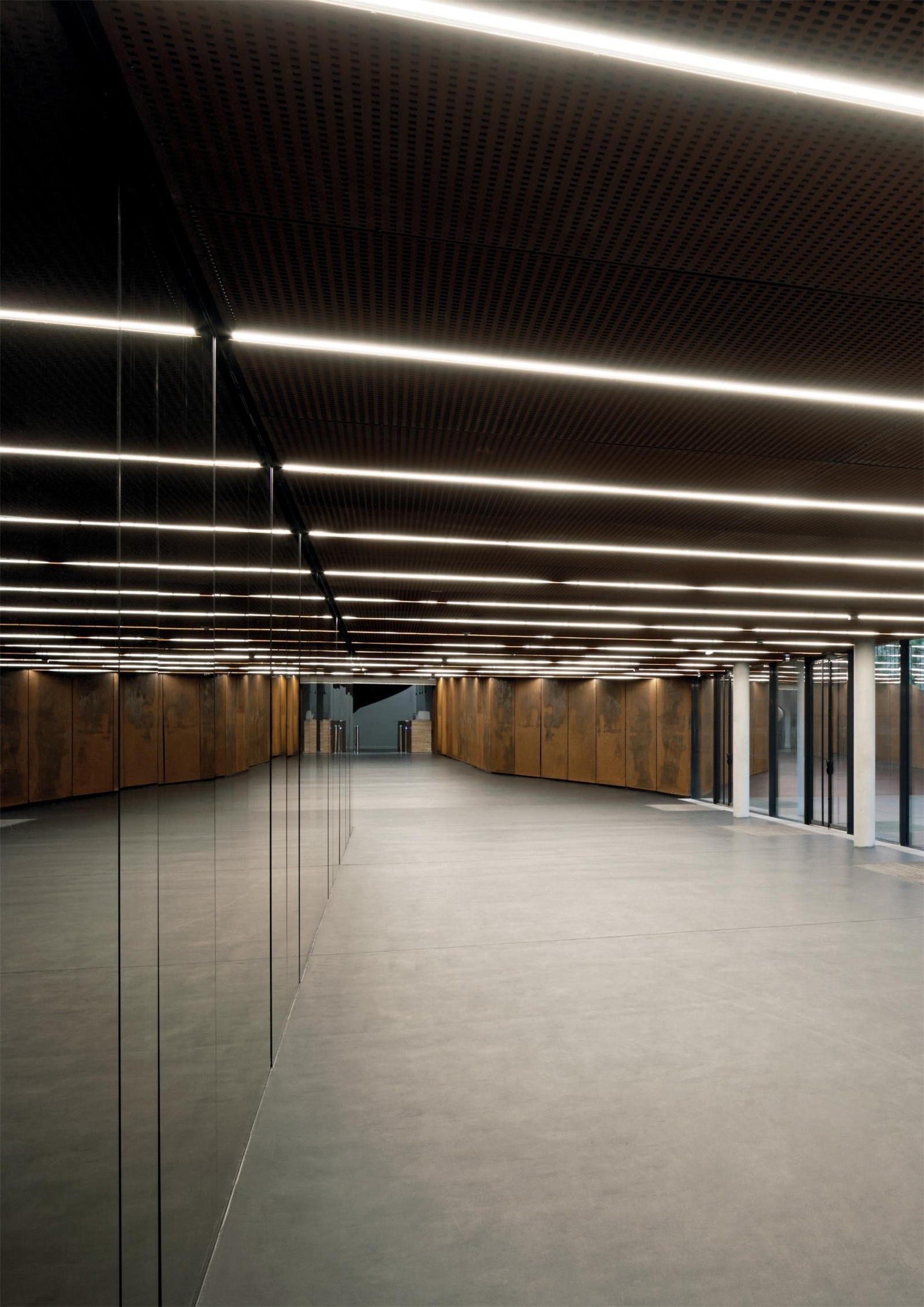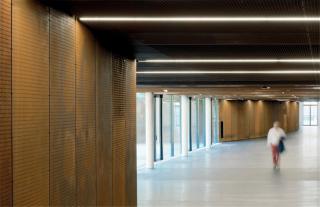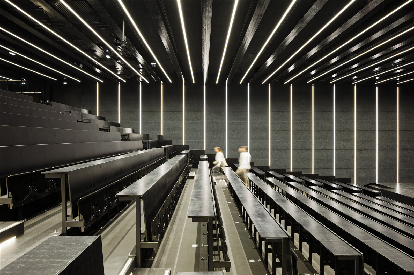 坐擁500個座位的階梯教室是露爾辛校區(qū)的主要特色。它位于閱兵場的最低點,也就是舊停車場的位置,且沿著南北軸線方向。劇場由完全覆蓋了自耐候鋼的走廊接入,使得中央廣場的連續(xù)性得以延伸。
