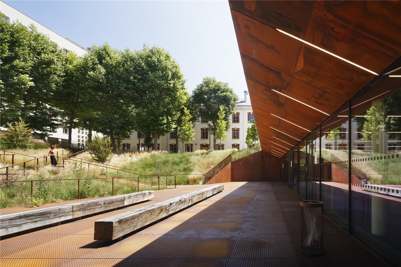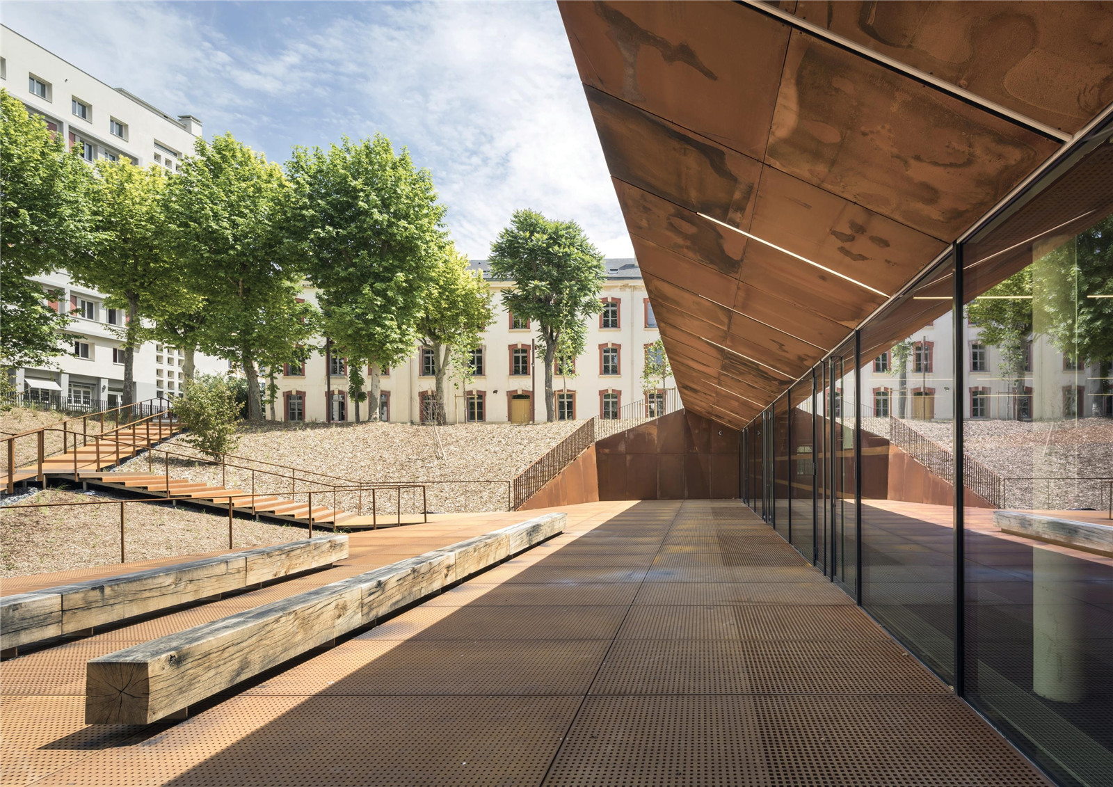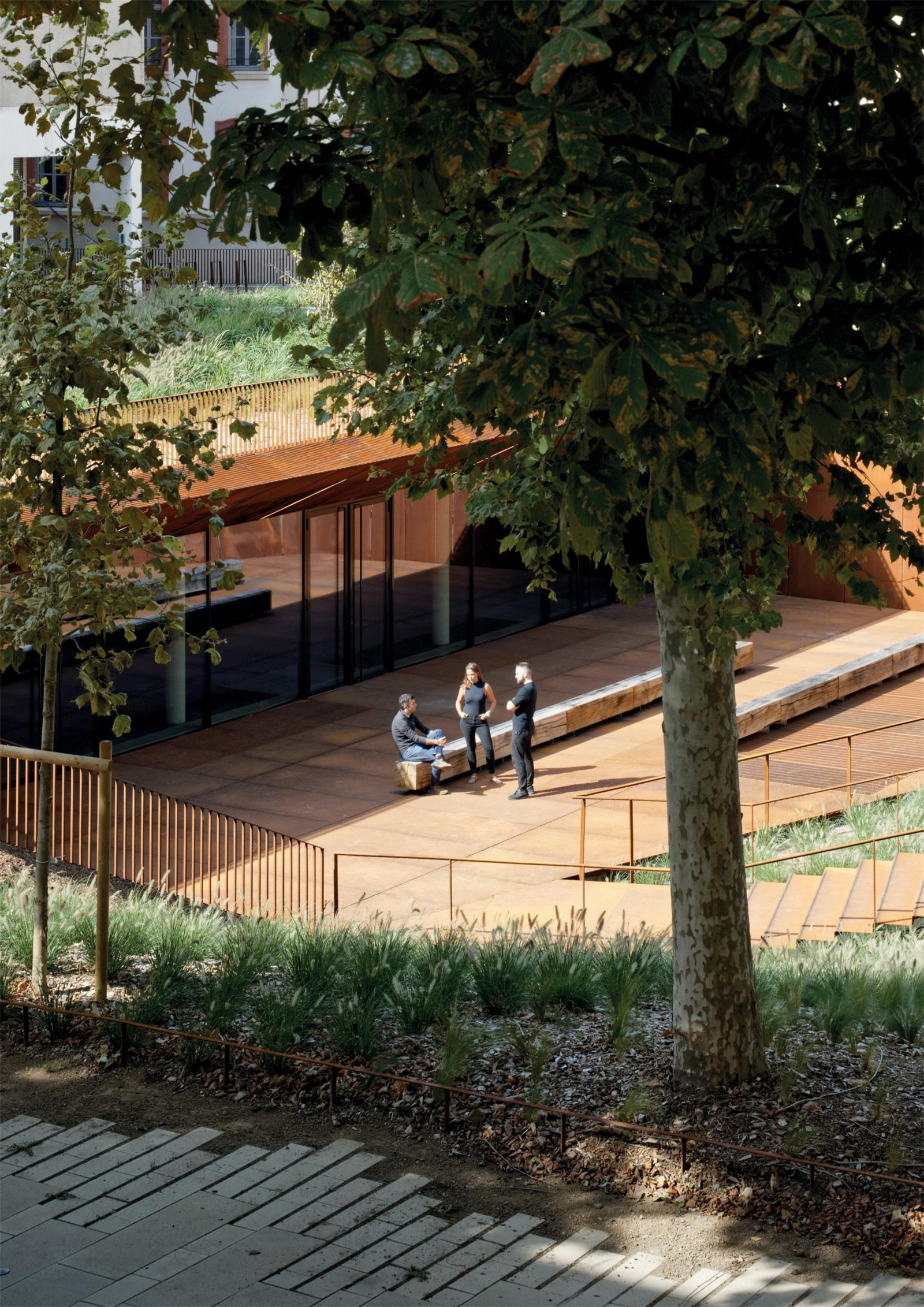 The 500-seat amphitheatre, a major feature of the Lourcine campus, is installed at the lowest point of the parade ground where the old car park was and along the north / south axis of the site. It is accessed through a gallery entirely covered with self-weathering steel that provides a continuity with the central esplanade.