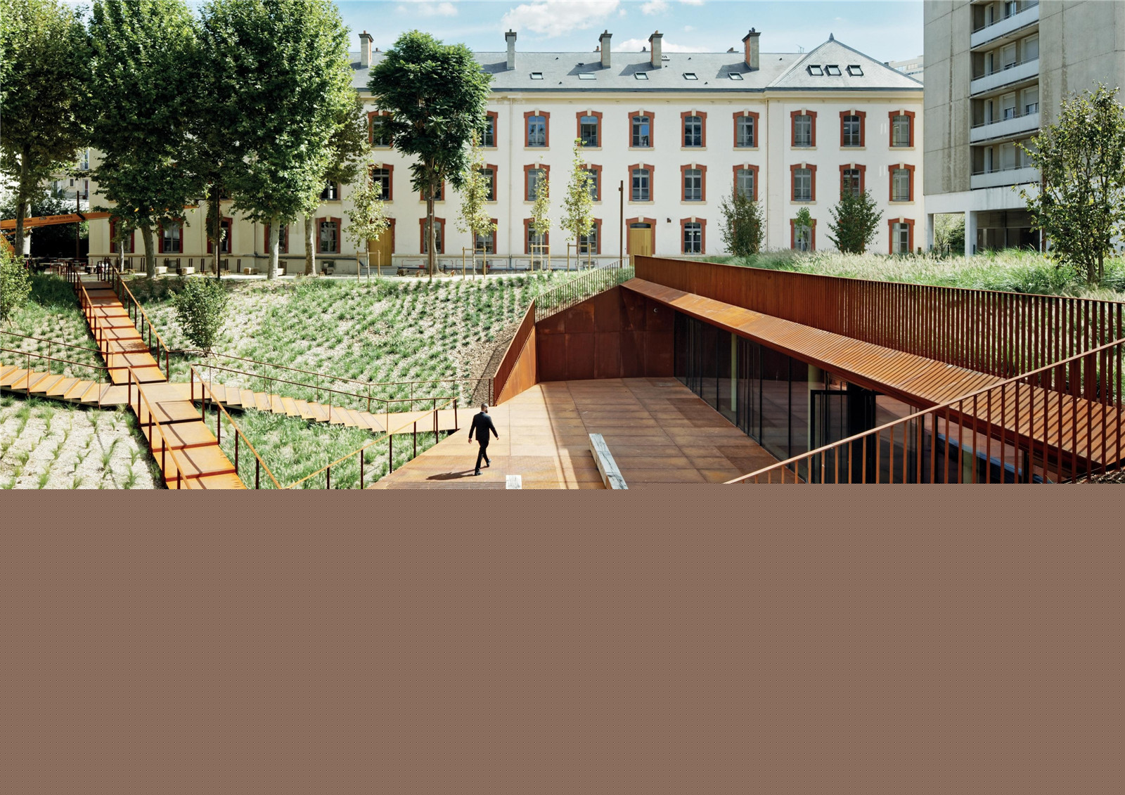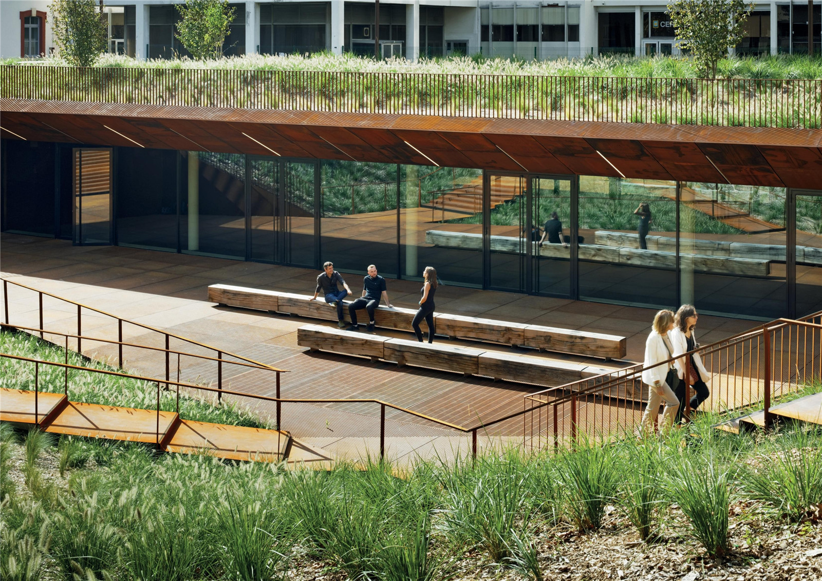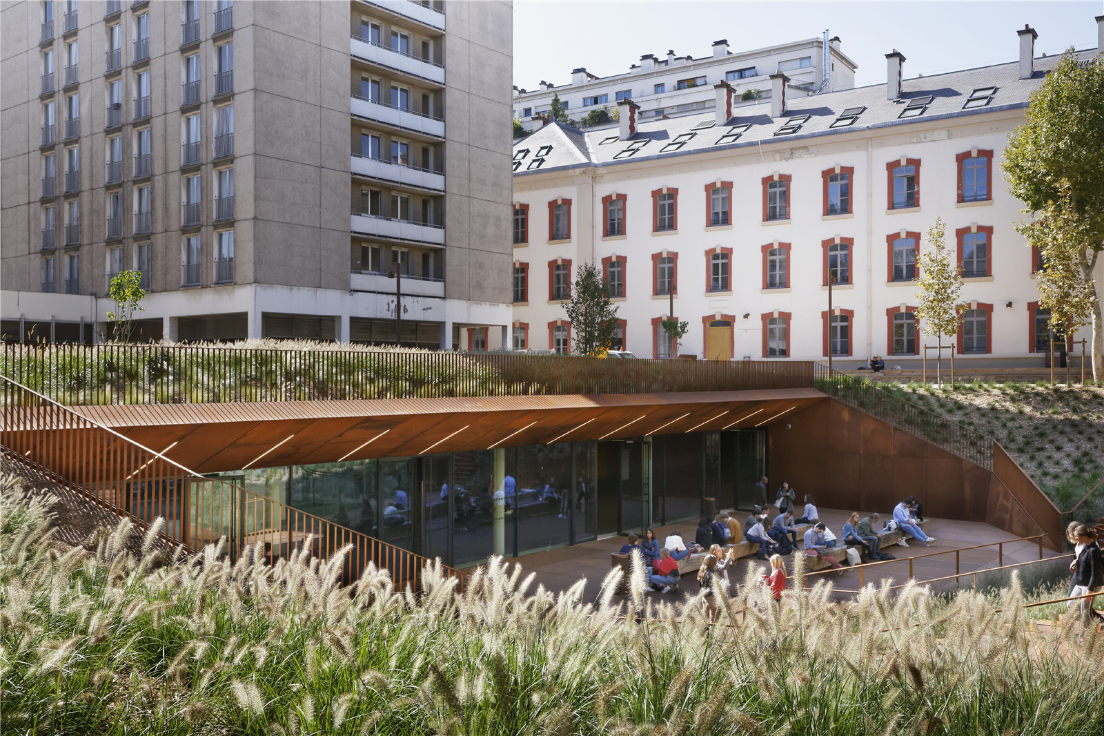 The 500-seat amphitheatre, a major feature of the Lourcine campus, is installed at the lowest point of the parade ground where the old car park was and along the north / south axis of the site. It is accessed through a gallery entirely covered with self-weathering steel that provides a continuity with the central esplanade.