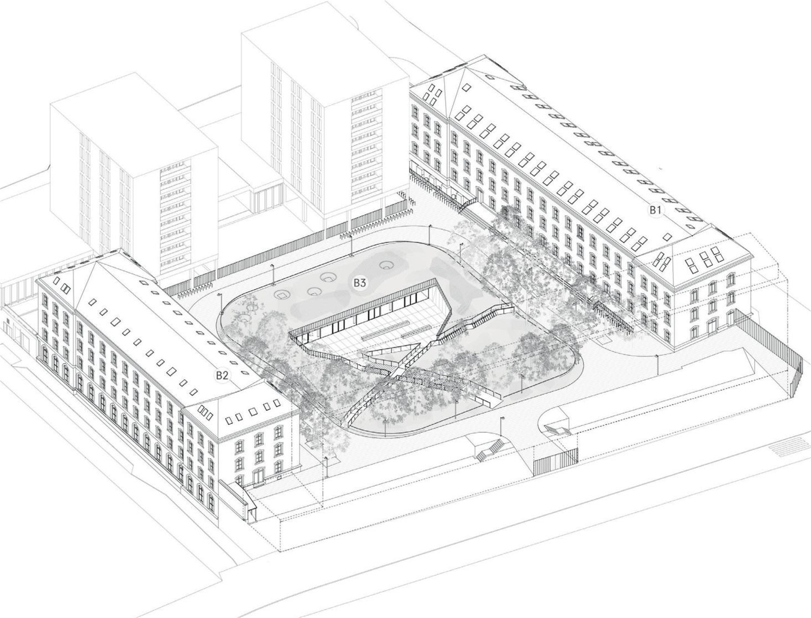 The challenge for the project is to preserve a precious heritage that bears witness to the urban history of this district while altering it as little as possible. The idea is to change the organisation of the barracks buildings to perfectly suit their new intended functions.