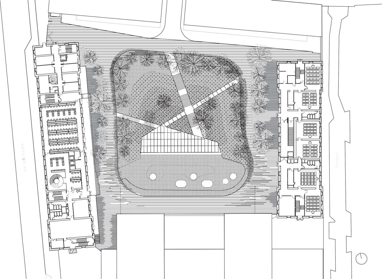 The programme installed on the lower level of the esplanade, which leads you down naturally, constitutes the heart of the Lourcine site. It is this central point that provides access to the library, located in building 1, via a direct link that crosses the sunken entrance and also provides access to the upper floors.