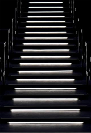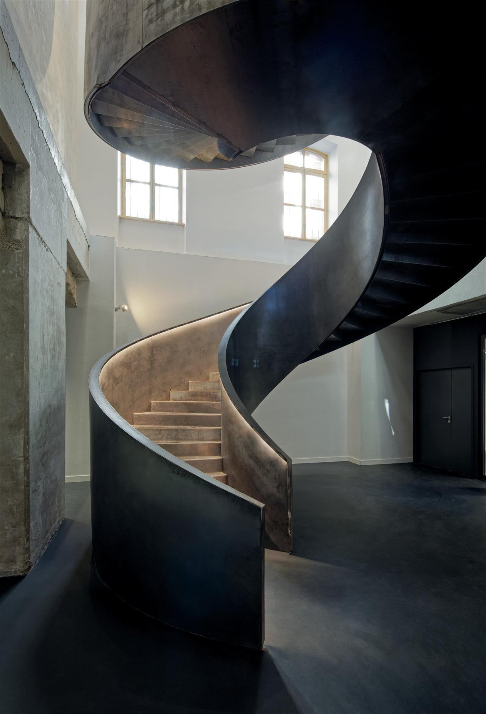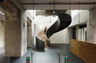 一座具有紀念意義的旋轉(zhuǎn)樓梯位于圖書館在花園層和一層的出入口位置。它的大小使之成為一個突出的建筑特色,同時也展示了建筑的空間和整體高度。