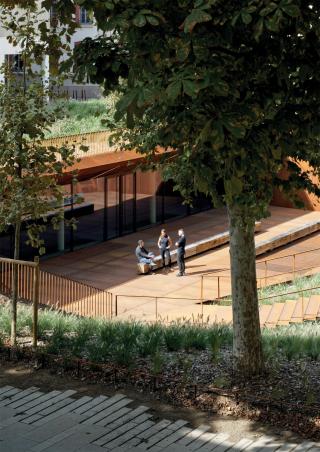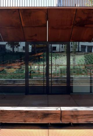 The self-weathering steel, a warm, vibrant and changing material, accompanies the visitor throughout all the outside public areas and extends right into the interior. It is a skin that shows the marks of time and embodies the new face of the Lourcine campus.