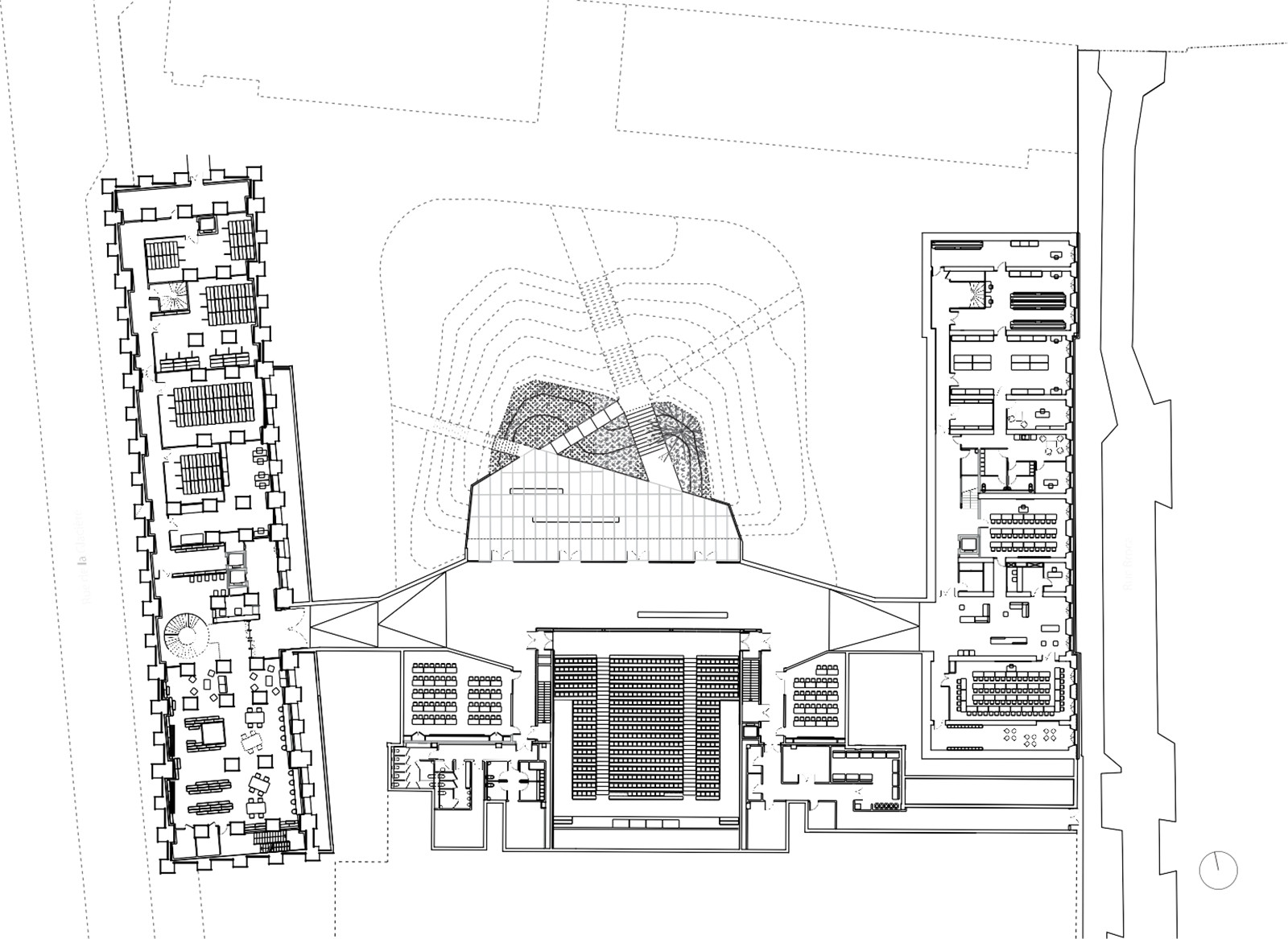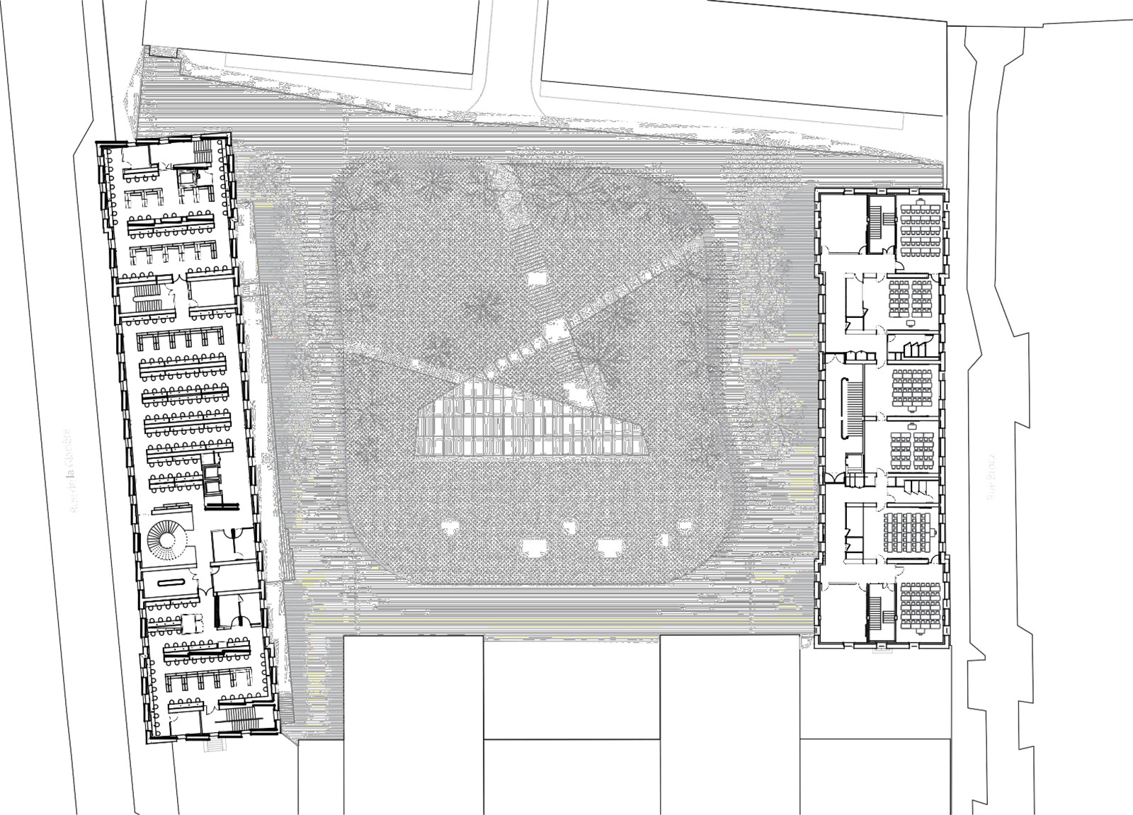 在另一側(cè),從同一個中心點出發(fā),學生們沿著階梯教室能夠到達位于布卡羅街的大教室,以及2號建筑上層的所有教學設(shè)施。