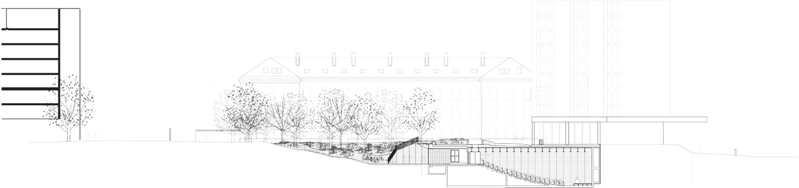 20世紀下半葉,該場地經(jīng)歷了系列變化,面對著皇家港大道與圣希波呂特街上的建筑被拆除,并新建了兩座宏偉的建筑物,以保持南北軸線對應(yīng)的格局。在圣希波呂特街一側(cè),一座雙層停車場設(shè)置在建筑物之下,與斜坡齊平,凸出向閱兵場。