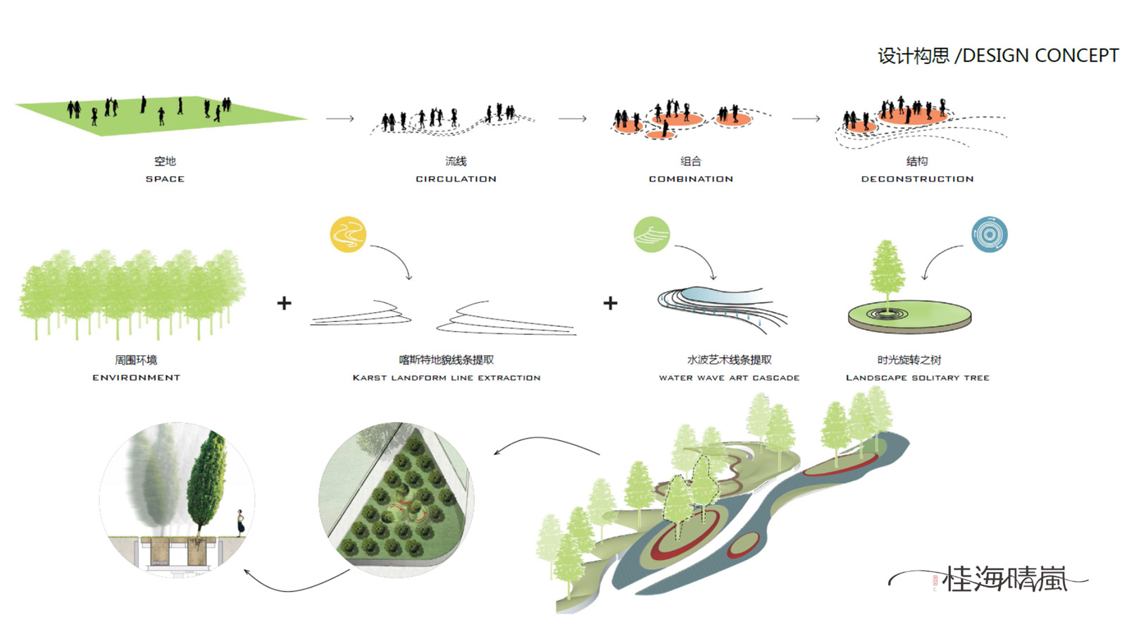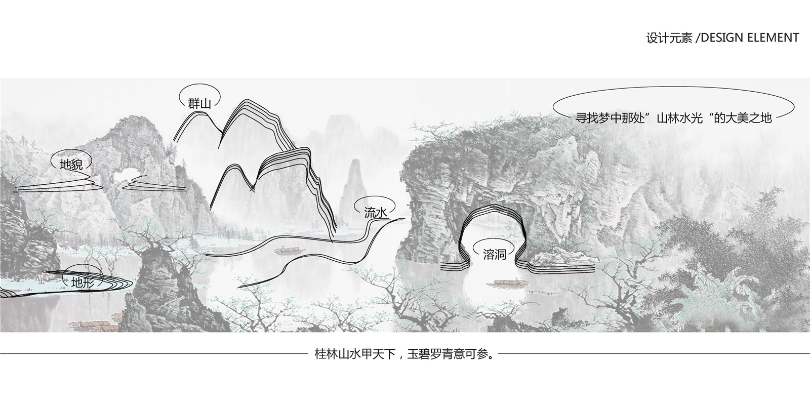 提取喀斯特地貌紋理,水波線條結(jié)合景物,應(yīng)用于景觀設(shè)計當(dāng)中,利用空間高差與水景結(jié)合,給大家?guī)韽囊曈X,聽覺,觸覺等多個方面的極大盛宴。