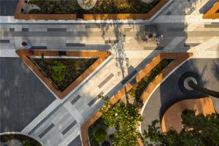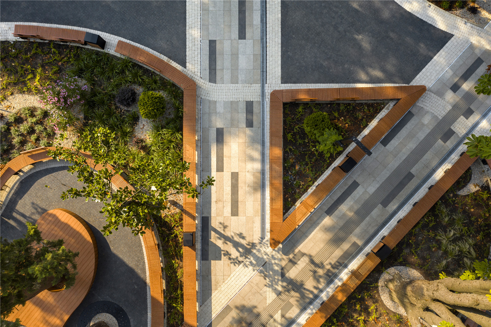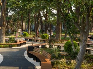 從兩條主干道上延伸出多條蜿蜒的小路,通往公園的不同區(qū)域。拐下主路,人們可以在環(huán)繞柏樹而建的木平臺上安靜休憩,在樹蔭下觀賞橄欖樹,或者在被茂盛植圍繞的長椅上放松休閑。綠色的草地和紫色的花朵讓人聯(lián)想到?jīng)坝康牟?、清新的海風與拍打著沙灘的浪花。這座曲線公園中的長椅均由設計師專門繪圖設計。