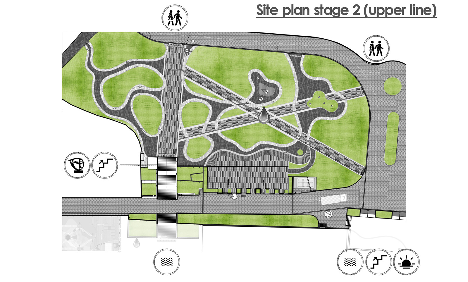 公園入口右側(cè)設計了一處露天展覽空間,在公園的開幕式期間,這里展示了該地區(qū)不同時期的歷史照片。今后展品或?qū)⒀a充與更換。