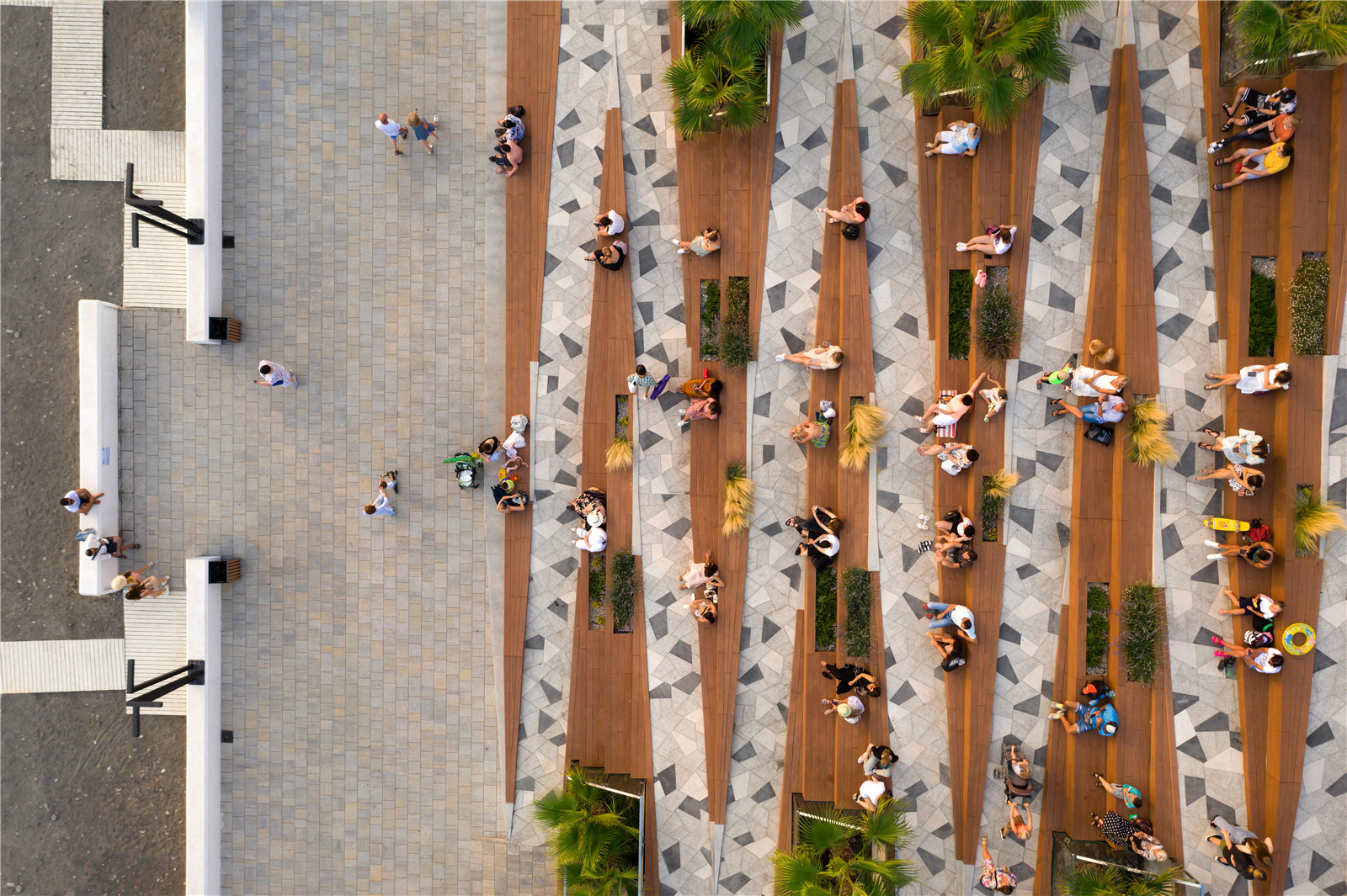 階梯式的露天劇場由多層木板搭建而成,木板下增設了嵌入式照明,設計師希望將此處打造為人們社交、表演、冥想以及欣賞海景的空間。階梯看臺的設計遵循了古希臘競技場的空間邏輯,用太陽運動的軌跡來決定整體建筑幾何形體的塑造。看臺間和諧地融入了不同品種的觀賞草,使這里成為溫暖季節(jié)最受歡迎的場所。