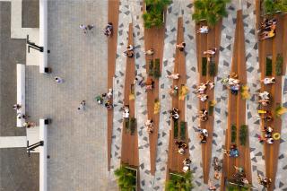 重建項目分為兩期。2020年落成的一期項目位于海濱低地勢區(qū),景觀主體是一座木制的露天階梯式劇場,24米長的階梯式看臺如瀑布般傾泄而下,人們可以在此觀賞日落美景。此外場地內(nèi)還設有健身設施,以及分散在園內(nèi)的定制建筑小品。