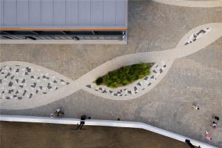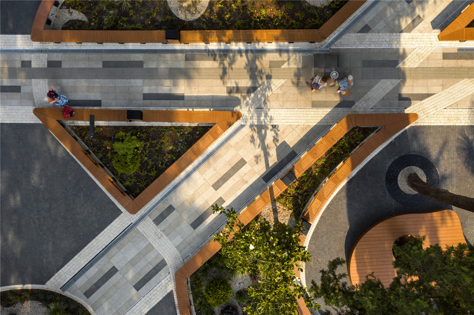 場地現(xiàn)存的栗樹和柏樹已有百年樹齡,保護這些古樹是花園設計中的重要任務之一。設計師圍繞這些古樹建造了波浪形的花卉種植池,與植被高低錯落的層次相呼應。為了縮短從公園入口到海灘步道的距離,設計師架設了兩條寬闊的步行道,來連接重要的交通節(jié)點。道路交叉口放置了一座直飲水裝置。