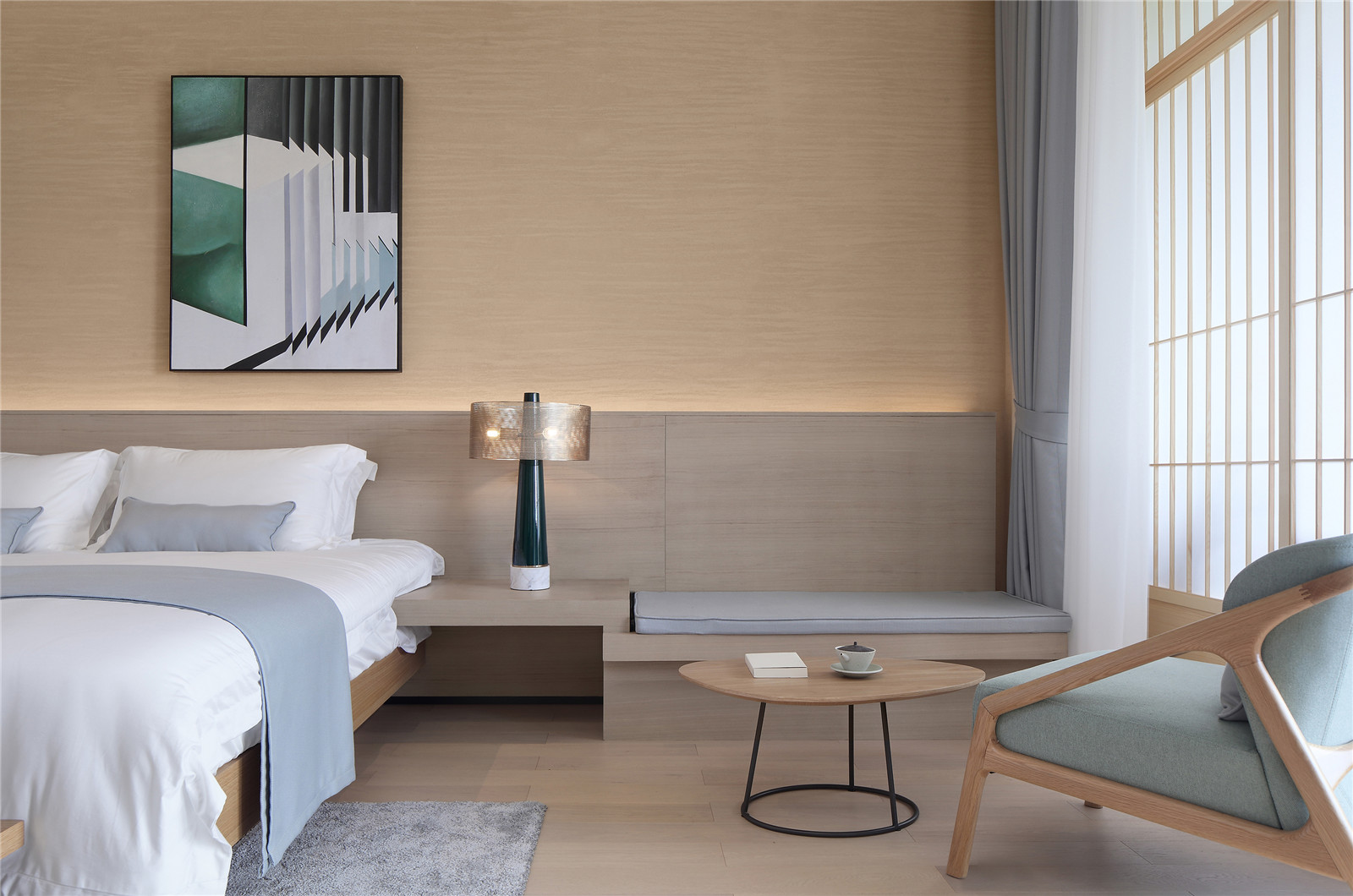The rammed earth material texture of the outdoor wall extends inward, and the diatom mud coating with surface paint treatment is applied to the interior facade decoration. Combined with wood veneer and the furniture system of wood color, it presents a simple and exquisite living environment as a whole, and also shows a special charm different from urban residences.