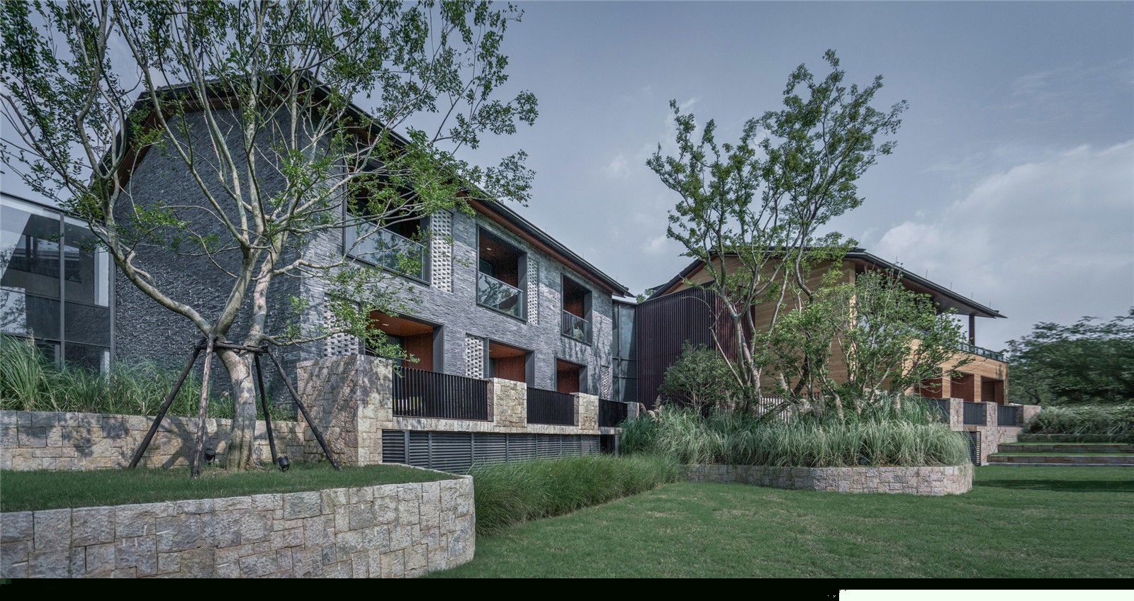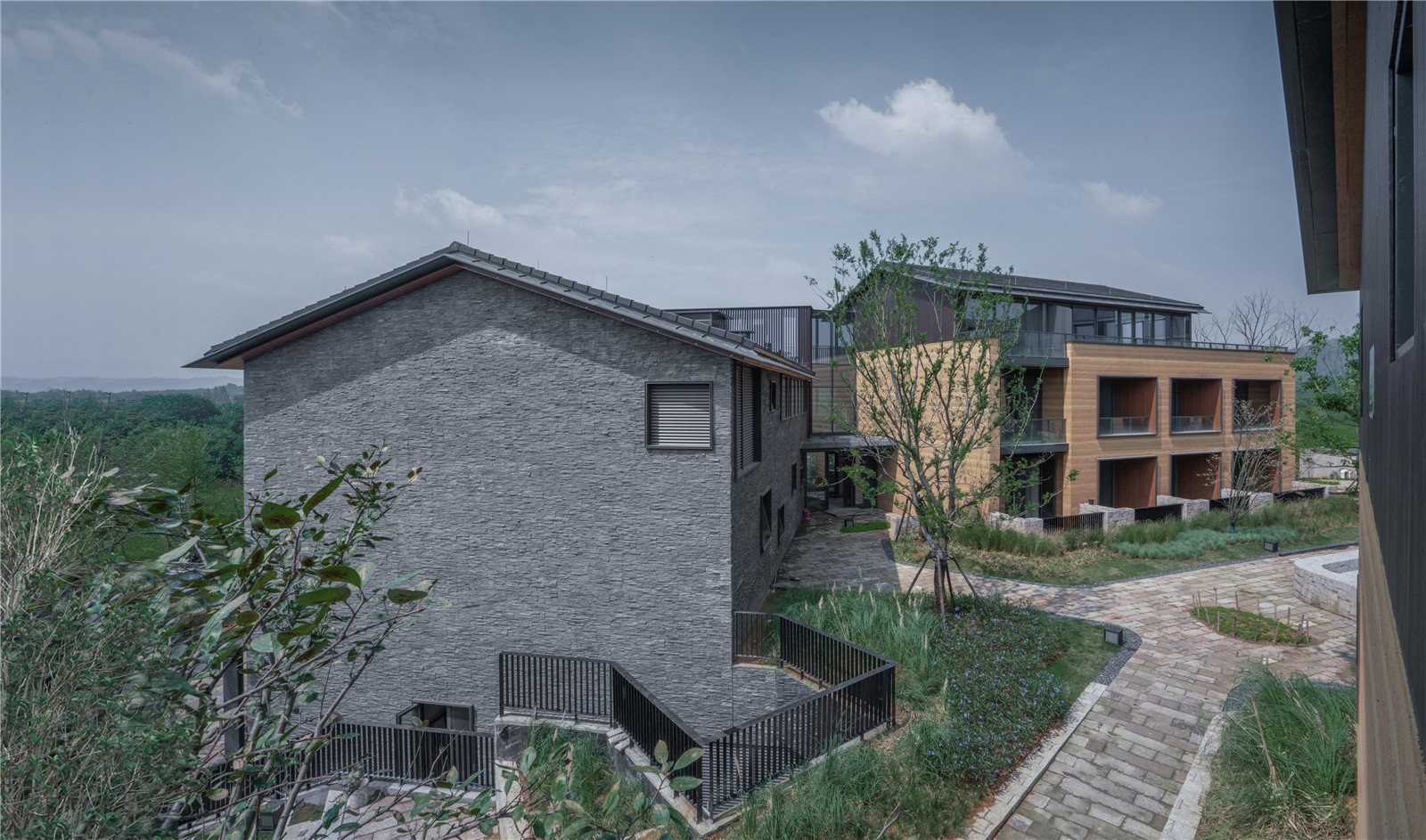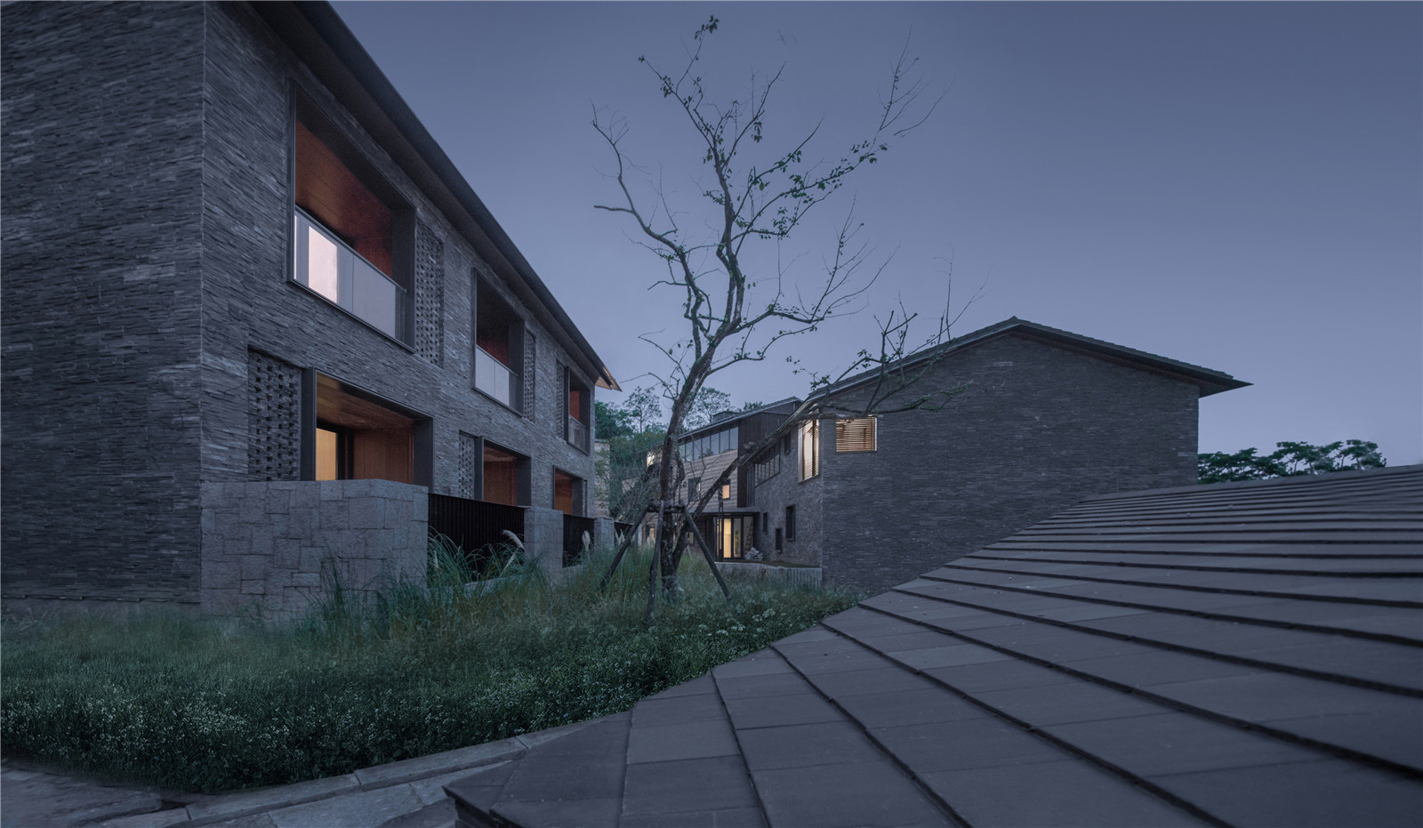 The individual building is a rectangular volume covered by a pitched roof. The roof adopts the linear shape of a traditional double pitch roof instead of a traditional Chinese curved roof. There are two types of roofs, the double pitch roof and the diagonally folded roof, which correspond to two different functions of guest rooms and public spaces.