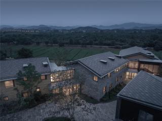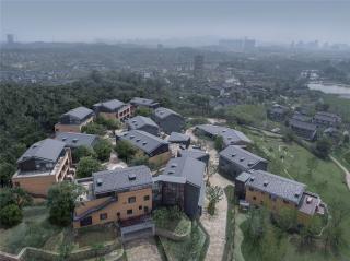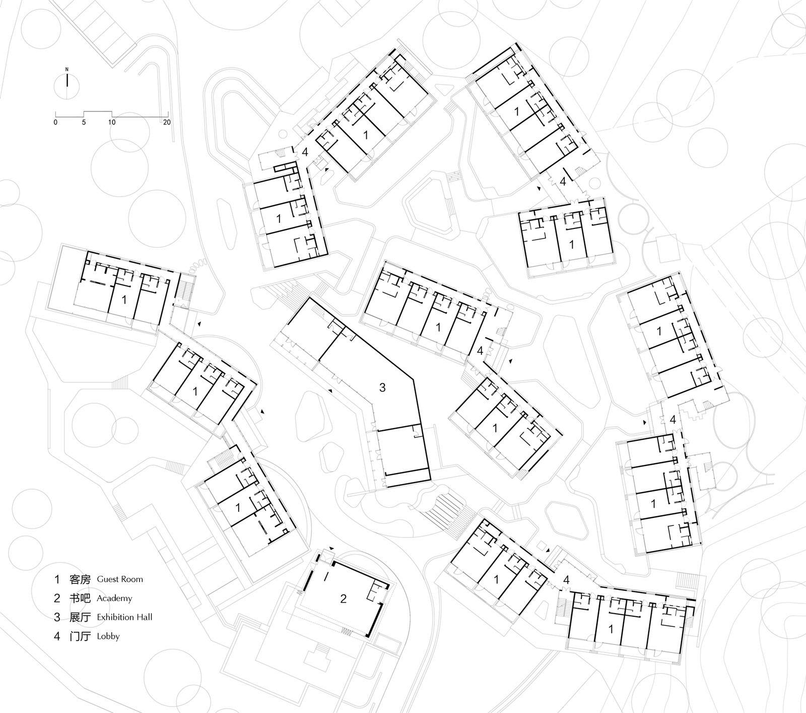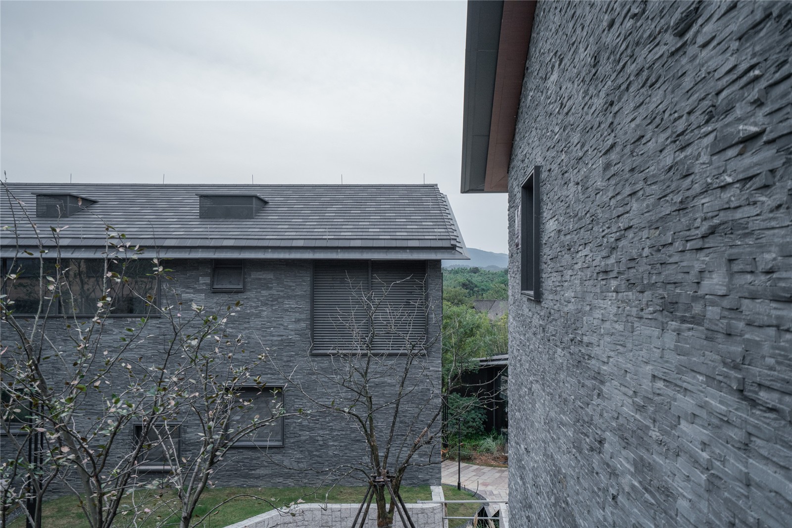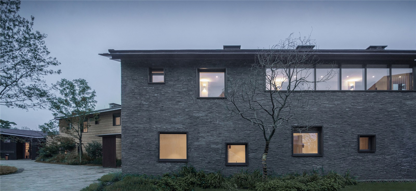 The individual building is a rectangular volume covered by a pitched roof. The roof adopts the linear shape of a traditional double pitch roof instead of a traditional Chinese curved roof. There are two types of roofs, the double pitch roof and the diagonally folded roof, which correspond to two different functions of guest rooms and public spaces.