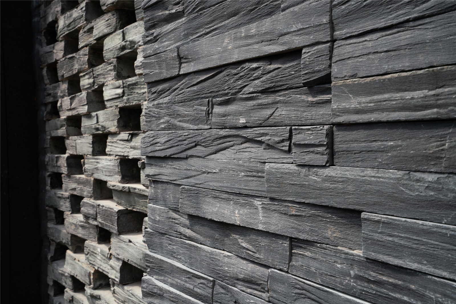 竹材——為了與“夯土”、“石屋”區(qū)別開(kāi),公共建筑采用黑色竹木板材。工業(yè)化的黑色竹木墻板以龍骨干掛于外墻表面,在形式上表達(dá)公共屬性。