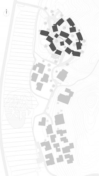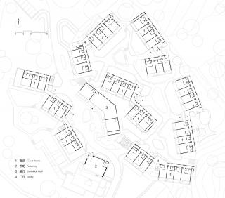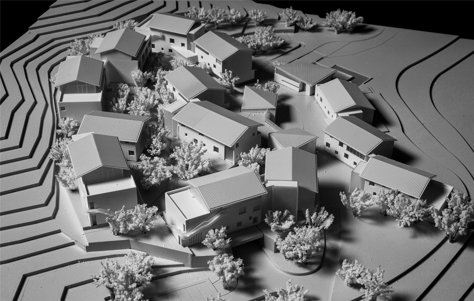 On the naturally terrains, the building units are laid out freely, taking advantage of the situation. Taking into account the base, orientation, viewable range, density and so on, the relationship between buildings is adjusted with the unit of 0.1 meter. The resulting “settlement” appears to be a random result, but is actually a precise calculation after more than 30 revisions.