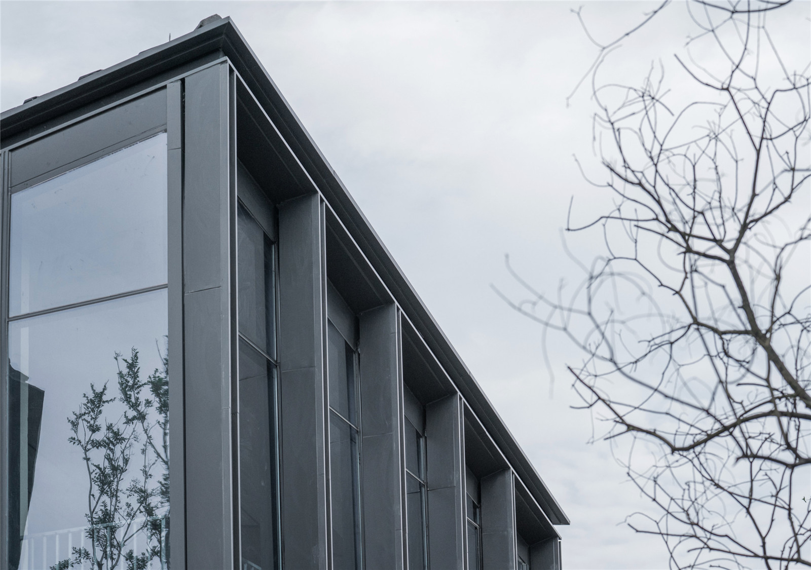 屋面平鋪平板水泥瓦,與檐口的交接處采用標(biāo)準(zhǔn)化截面的鋁板折邊收口,提升設(shè)計(jì)的精致感,也減少瓦屋面的裝飾配件,降低成本。