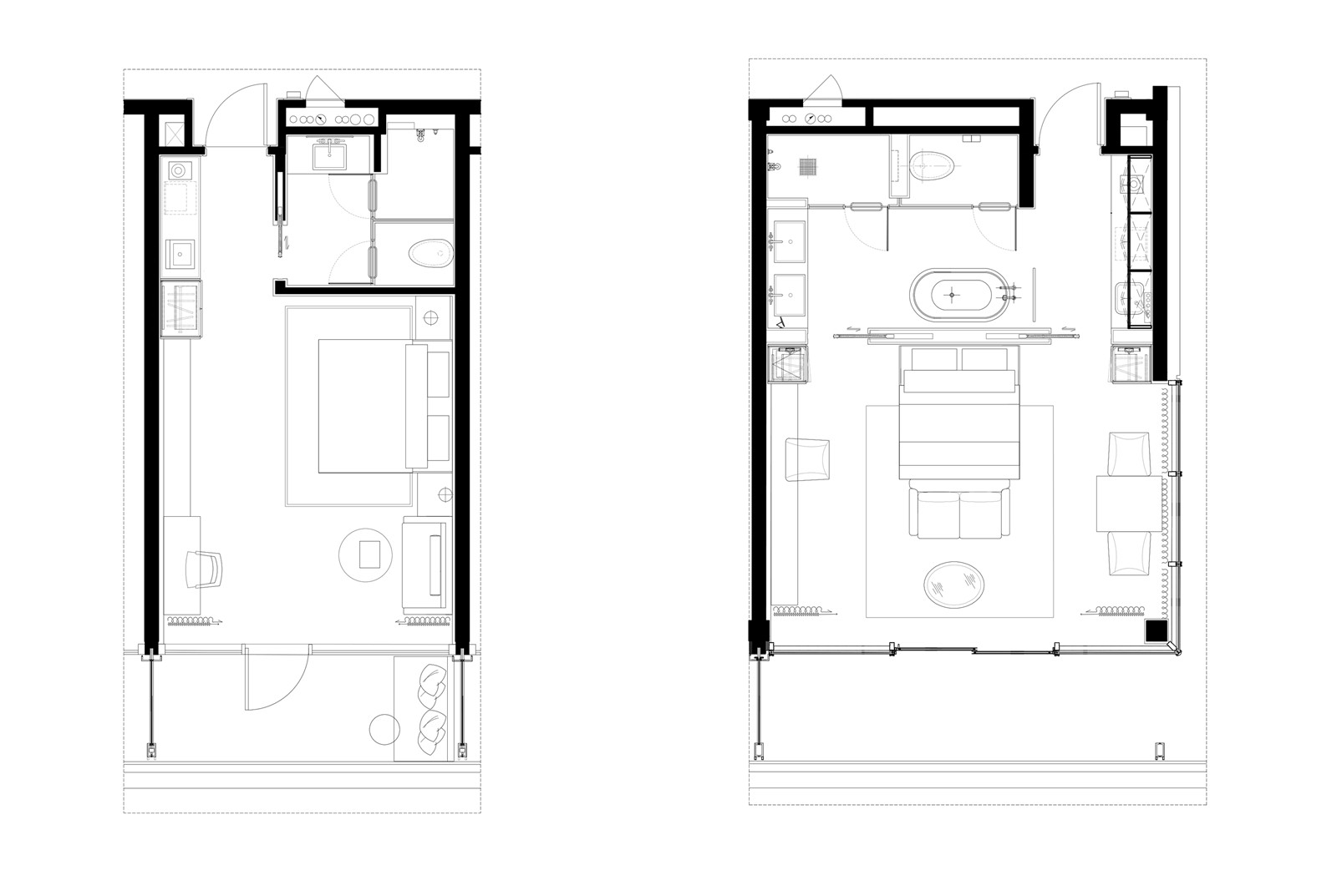 The scheme of two buildings with three staircases and public lobby hall in the middle is for less shared area and more available floor area. The independent vertical transportation system is more conducive to the shape of the building, and the corridor can also realize the connection between public and private.