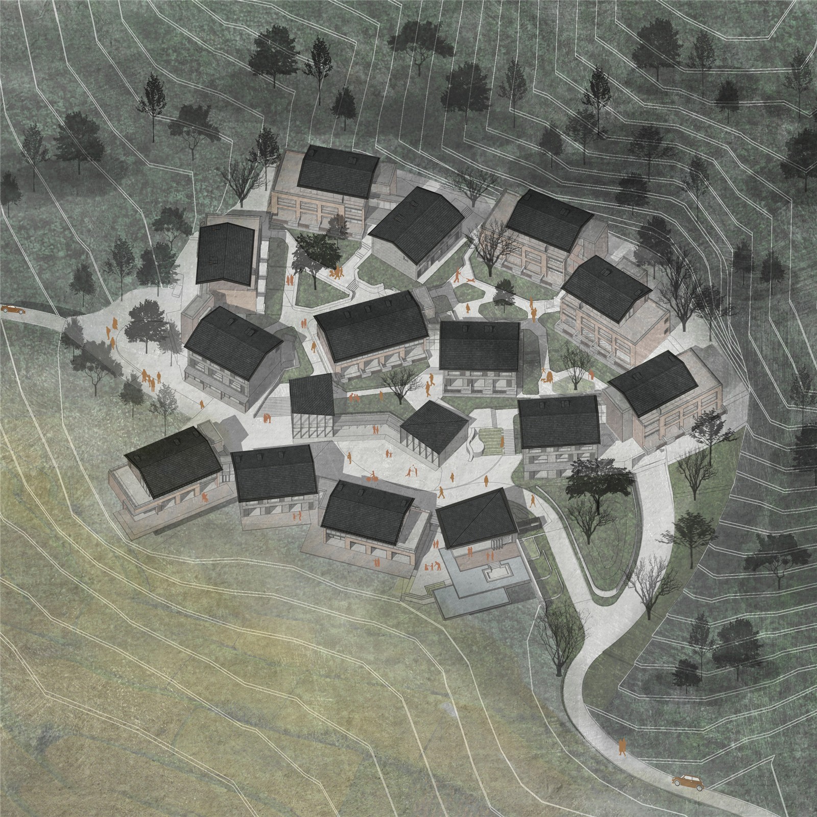 在自然起伏的山地上,各個(gè)單體自由布局,順勢(shì)順地而為。在兼顧基地、朝向、視線、密度等,以0.1米為單位調(diào)整建筑之間的關(guān)系,最終所呈現(xiàn)出的“聚落”看似是隨機(jī)的結(jié)果,實(shí)則是在三十余次修改后的精密測(cè)算。
