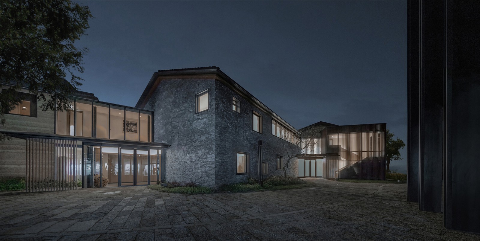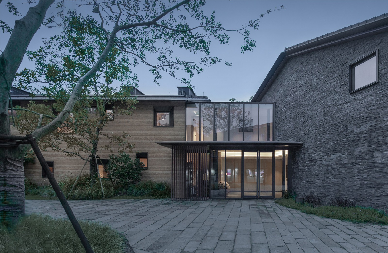 The wall materials are mainly natural and localized, including rammed earth, strip stone and bamboo-wood wall panels.