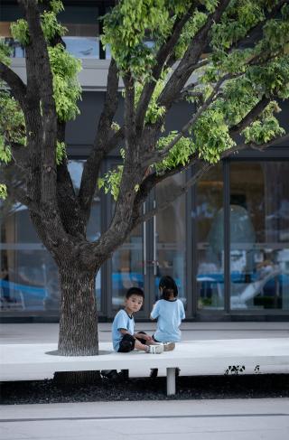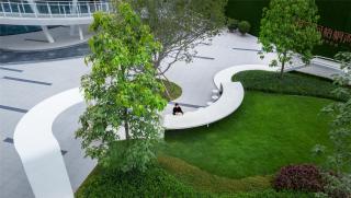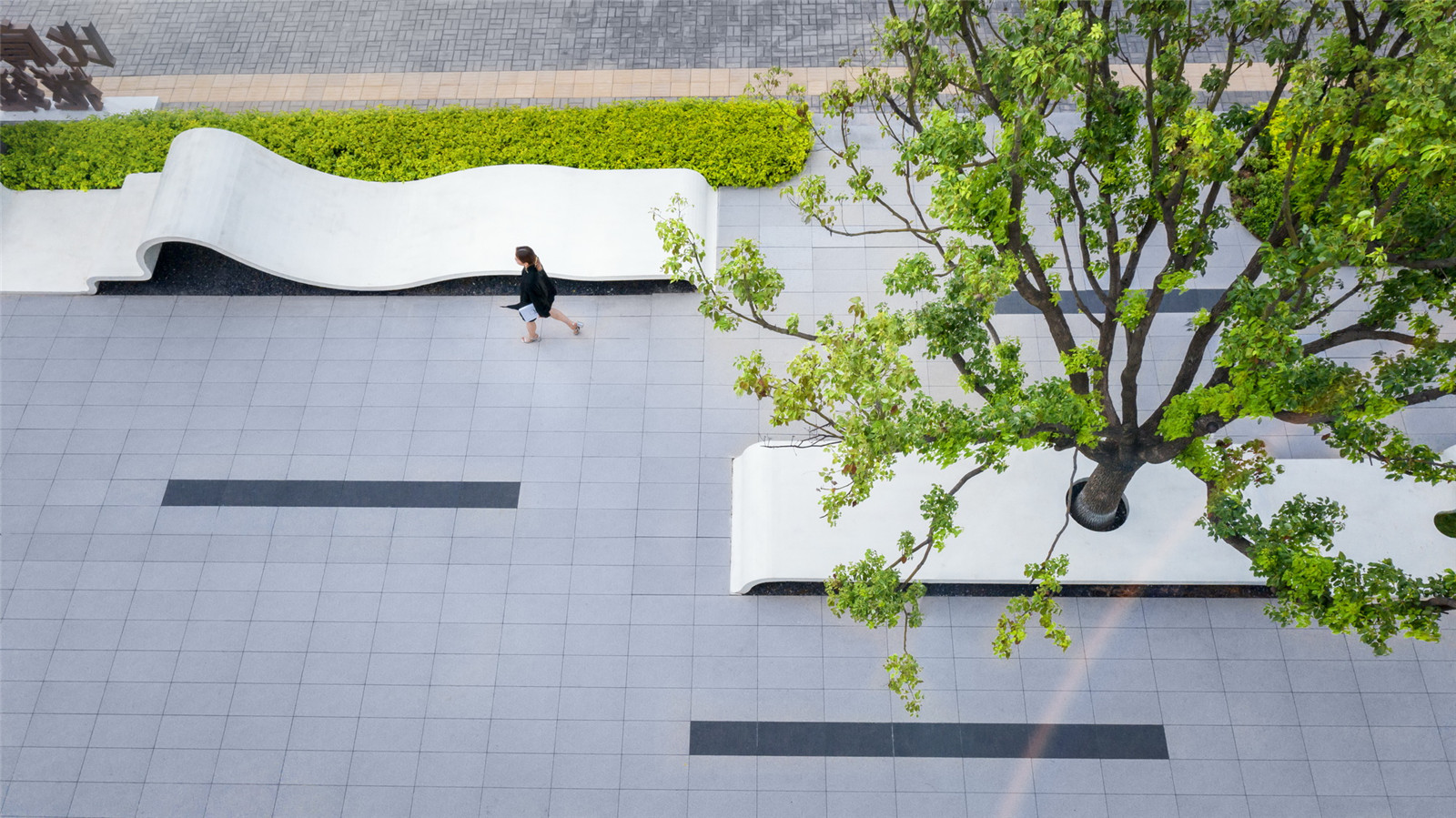 條形的綠籬帶與白色藝術(shù)共享座椅,經(jīng)過(guò)排列、重疊,形成一個(gè)集設(shè)計(jì)感、舒適感、通透感于一體的現(xiàn)代化共享商區(qū)綠化空間。