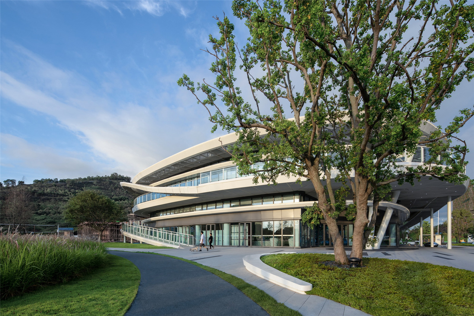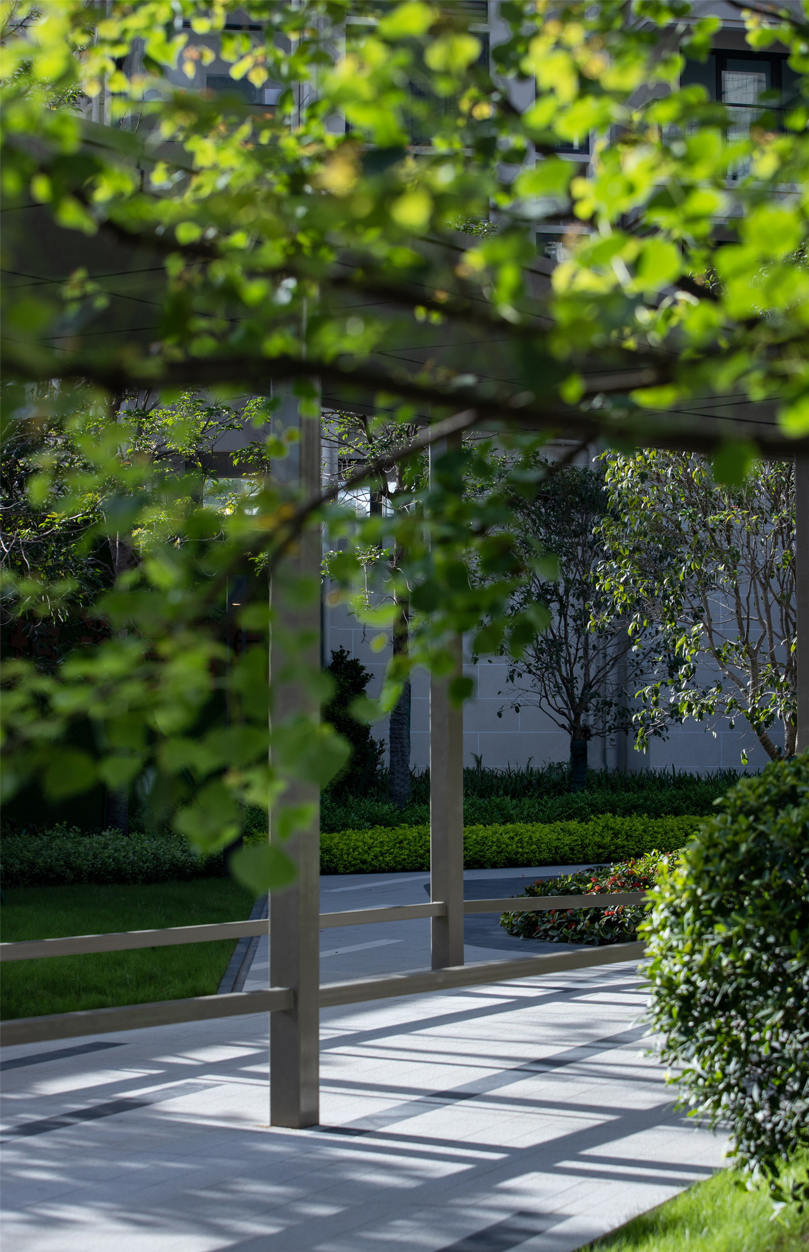 半對(duì)稱式的迎賓水景、特色植物樹(shù)陣與折線連廊的組合,共同營(yíng)造出歸家旅程的儀式感。水綠交融,怡然自得。