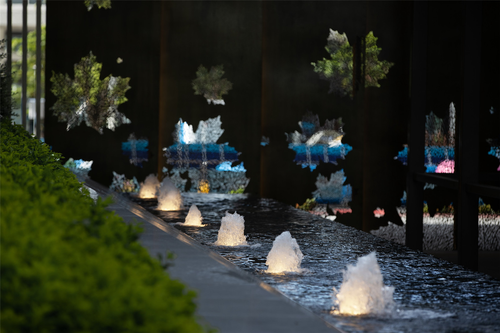 提煉并利用夜空星座連接的折線元素打造梧桐水景,造型干凈簡(jiǎn)練,恍若富貴花開(kāi)。水聲淙淙,伴著鳥(niǎo)語(yǔ)啁啾,仿佛置身山林,讓人內(nèi)心寧?kù)o。