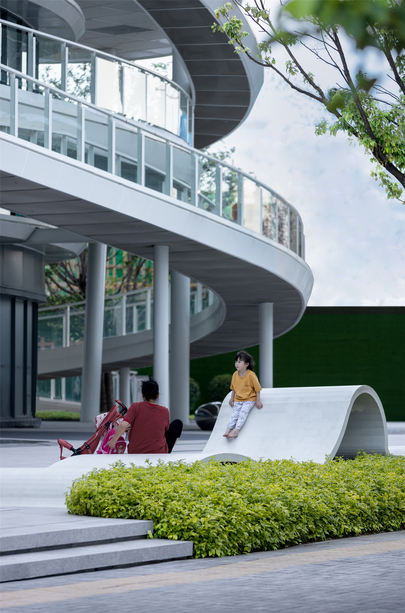伴隨空間的轉(zhuǎn)換,不同造型的弧形鋼板打造而成的鄰里共享環(huán),融合了吧臺(tái)、座椅、logo標(biāo)識(shí)、躺椅、滑梯等功能,在綠色基調(diào)中,如同街頭口袋公園,呈現(xiàn)多元質(zhì)感與豐富體驗(yàn)。